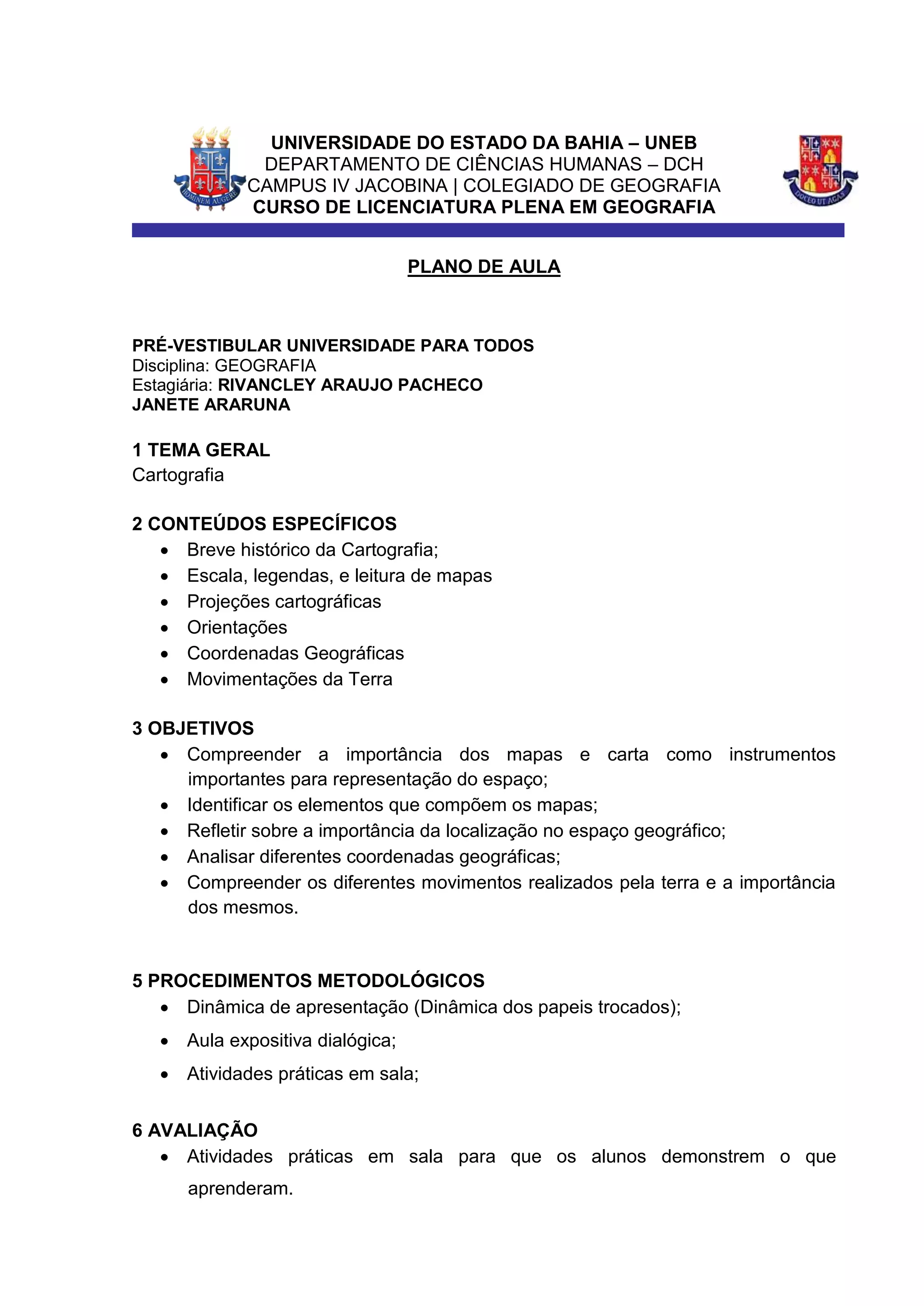 Este plano de aula descreve uma lição sobre cartografia para estudantes pré-vestibulares. A lição irá cobrir o histórico da cartografia, elementos de mapas como escala e legendas, projeções cartográficas, coordenadas geográficas e os movimentos da Terra. Os objetivos são ajudar os alunos a compreender a importância dos mapas e desenvolver habilidades de leitura e interpretação de mapas. A lição usará dinâmicas de grupo, discussão e atividades práticas para avaliar o apre