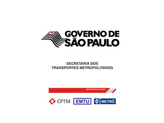 REDE METROPOLITANA TRANSPORTESCPTM METRÔ EMTU 22 municípios Município de São Paulo 67 municípios (3 RMs) 2 milhões passageiros / dia 3,3 milhões passageiros / dia 2 milhões passageiros / dia 261 km de trilhos 61,3 km de trilhos 33 km corredor 6 linhas 4 linhas 850 linhas 5.380 coletivos 89 estações 55 estações 10 terminais na RMSP 2 terminais na RMC