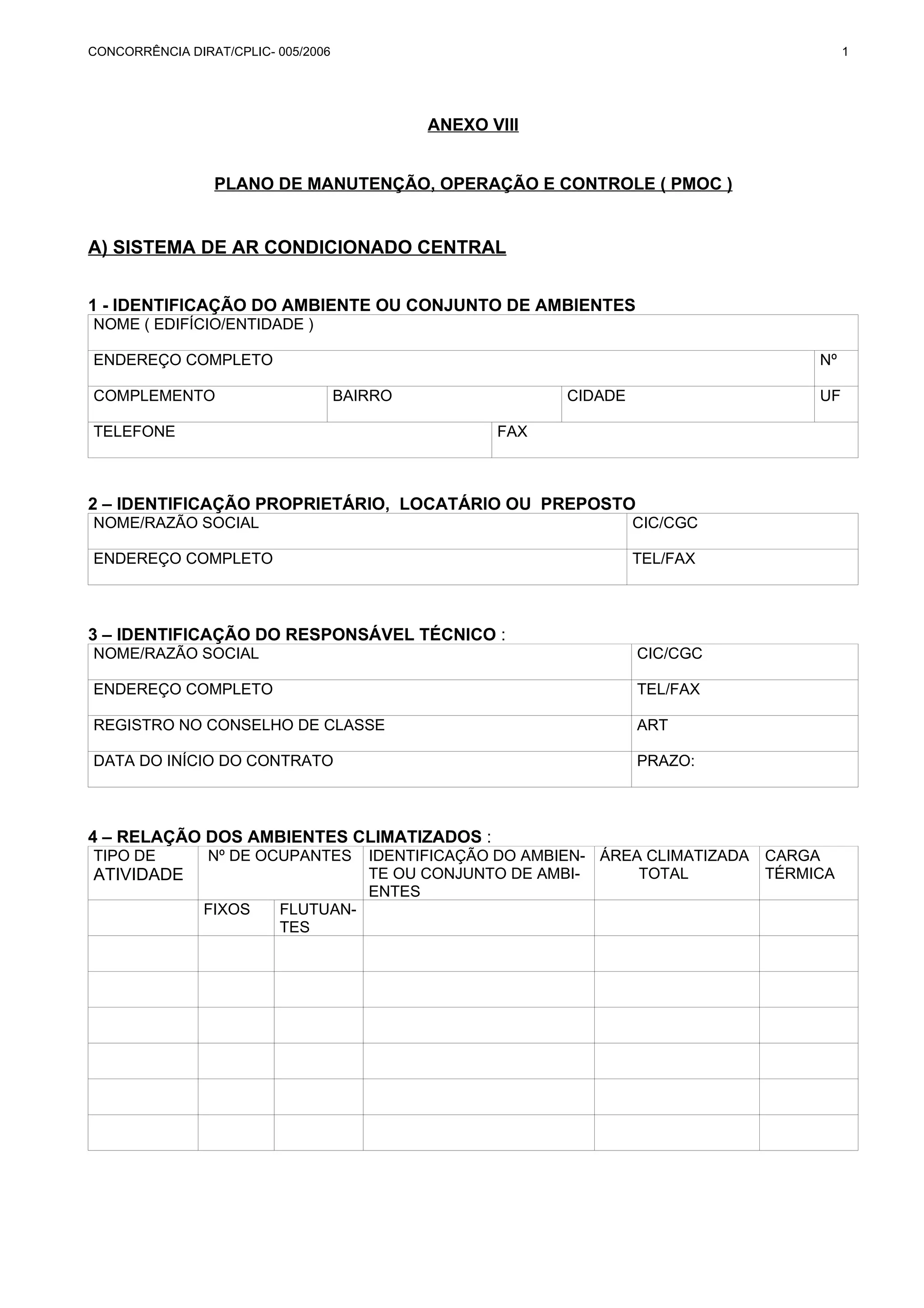 Este documento apresenta o Plano de Manutenção, Operação e Controle (PMOC) para o sistema de ar condicionado central de um prédio. Ele lista os itens a serem inspecionados periodicamente, incluindo condensadores, evaporadores, dutos, quadros elétricos, medidores e bombas de água, bem como as ações corretivas a serem tomadas. O plano especifica as tarefas mensais, trimestrais, semestrais e anuais necessárias para manter o sistema funcionando de forma eficiente e segura.
