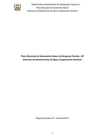 O documento apresenta o Plano Municipal de Saneamento Básico de Bragança Paulista, com o diagnóstico dos sistemas de abastecimento de água e esgotamento sanitário do município. Inclui informações sobre a caracterização do município, diagnóstico operacional dos sistemas, metas de universalização, programas e ações propostos, entre outros aspectos relevantes para o planejamento do saneamento básico no local.