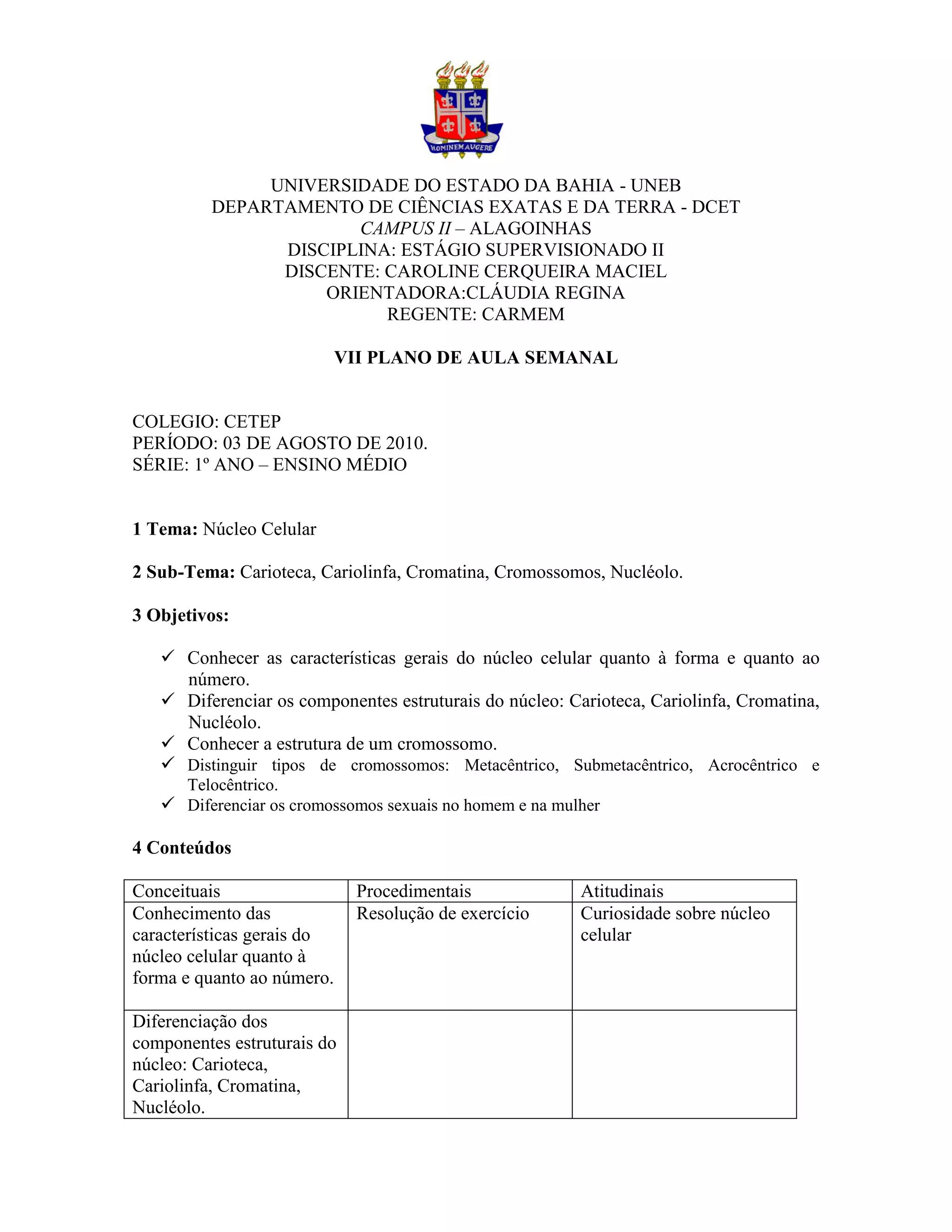 [1] O documento descreve o sétimo plano de aula semanal para estudantes do 1o ano do ensino médio sobre o tema do núcleo celular, incluindo seus objetivos, conteúdos, procedimentos metodológicos e avaliação. [2] Os objetivos incluem conhecer as características do núcleo celular, seus componentes estruturais e tipos de cromossomos. [3] A aula será conduzida por exposição oral, discussão com perguntas e demonstração de slides.