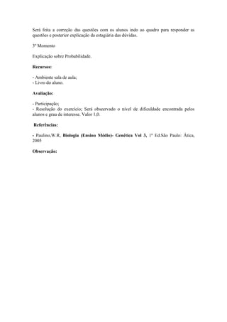 Este plano de aula descreve uma lição de biologia sobre ausência de dominância e probabilidade para alunos do 3o ano do ensino médio. A aula será dividida em três partes: correção de exercícios, explicação de dúvidas e uma explicação sobre probabilidade. O objetivo é ajudar os alunos a reconhecer a diferença entre dominância e ausência de dominância e interagir com noções de probabilidade.