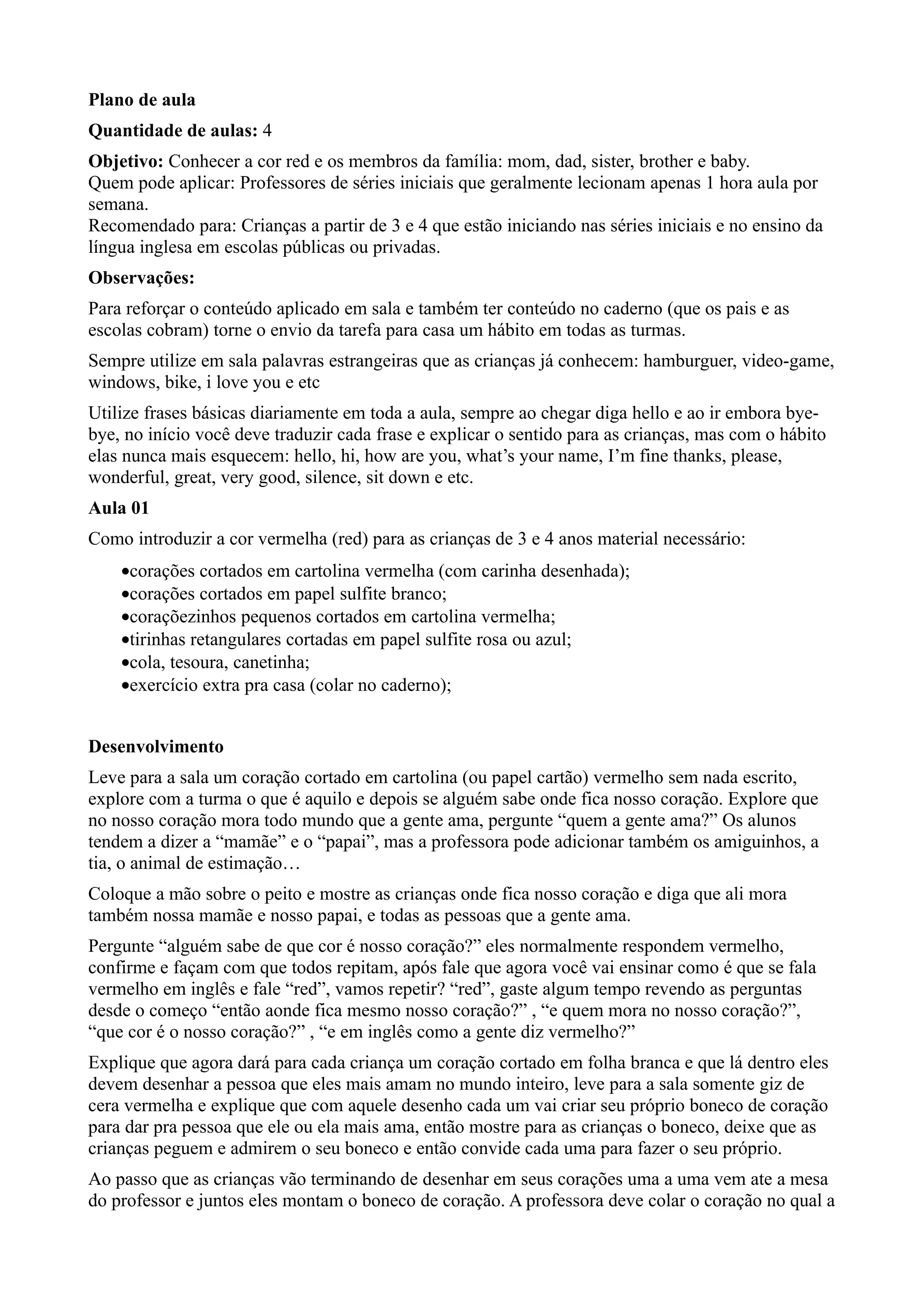 O plano de aula consiste em 4 aulas para ensinar cores e membros da família em inglês para crianças de 3-4 anos. As aulas incluem atividades práticas como desenhar corações vermelhos, fazer suco vermelho e jogar jogo da memória para reforçar os conceitos de "vermelho", "mamãe", "papai" e outros membros da família.