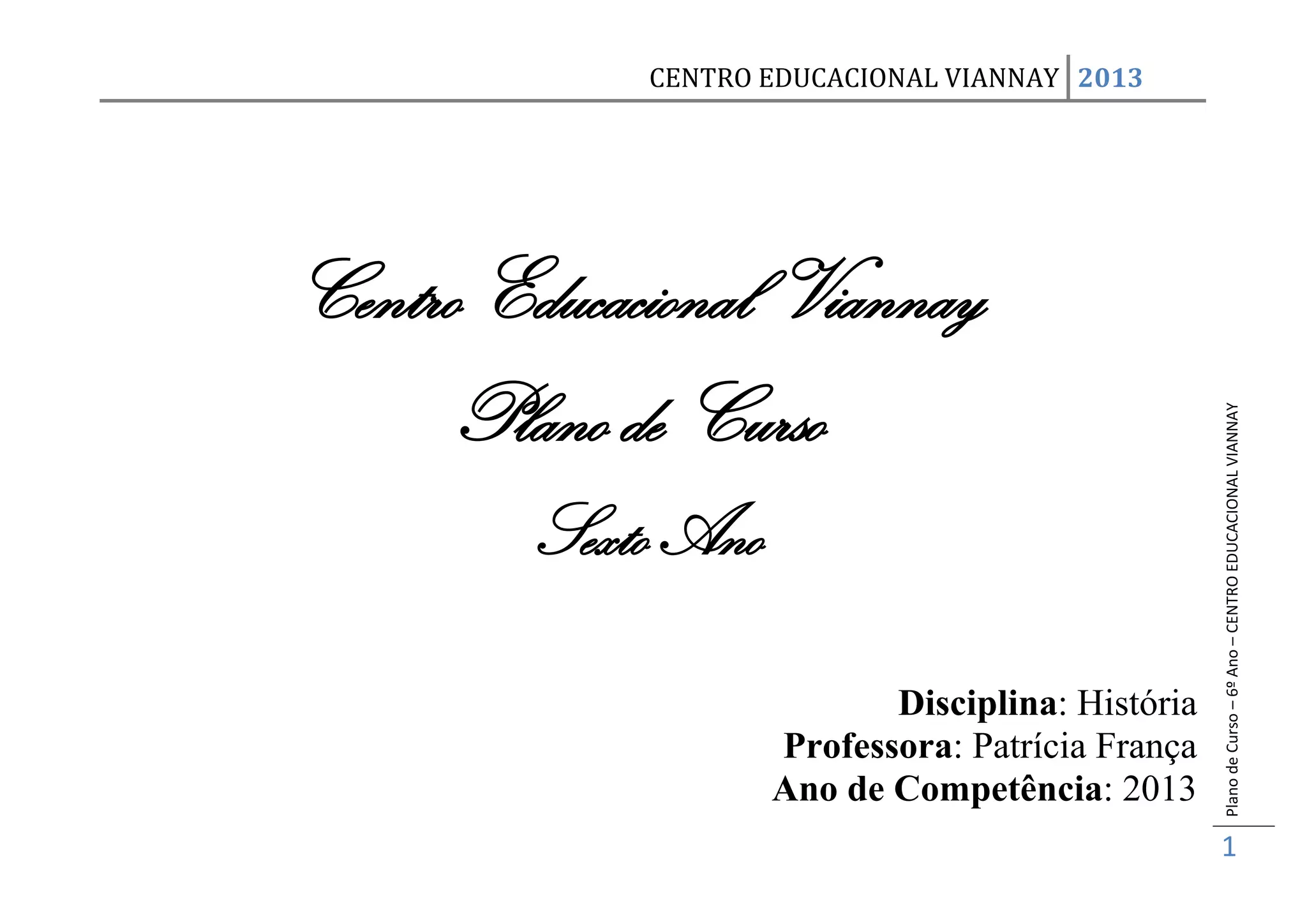 O documento apresenta o plano de curso da disciplina de História para o 6o ano do Centro Educacional Viannay. O plano está dividido em três unidades que abordam diferentes temas históricos ao longo dos três bimestres. A primeira unidade trata de conceitos históricos como cultura, tempo e períodos. A segunda aborda a pré-história e os primeiros povoamentos da América. E a terceira fala sobre as civilizações da Mesopotâmia e do antigo Egito.