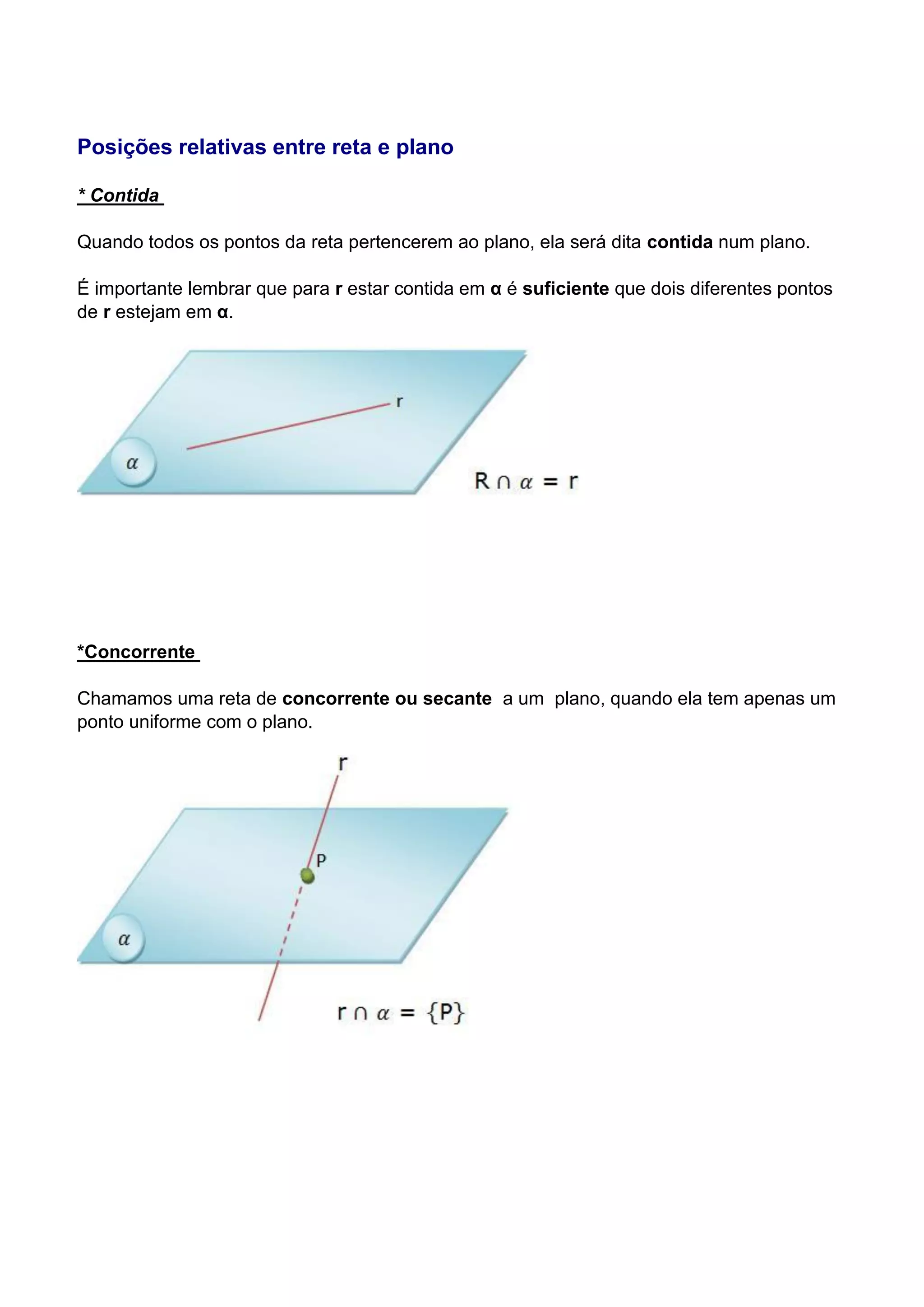 O documento descreve as posições relativas entre retas e planos, incluindo retas contidas, concorrentes e paralelas a planos. Também discute posições de planos coincidentes, concorrentes, paralelos e perpendiculares, além de projeção ortogonal de pontos e figuras sobre planos.