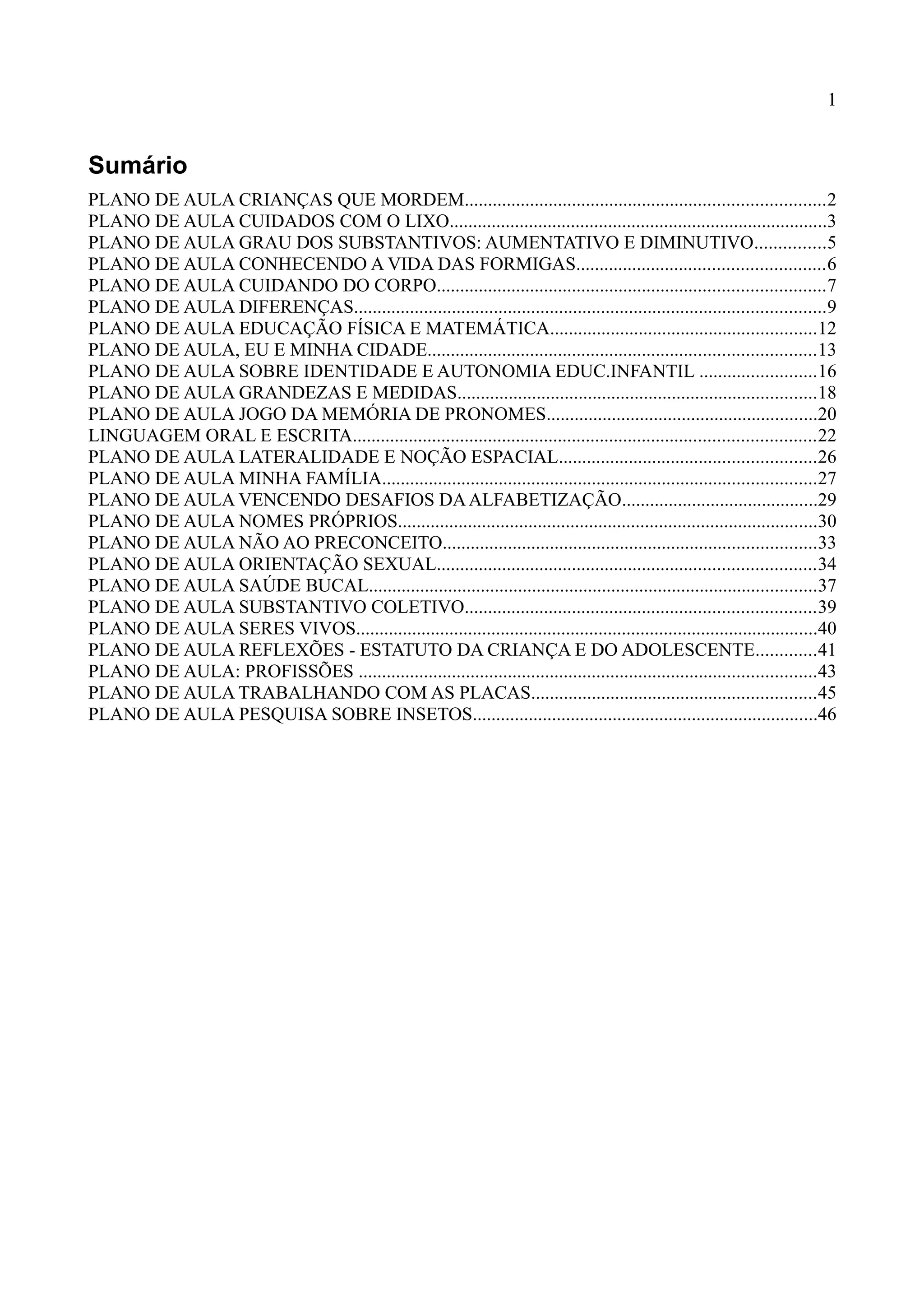 Este documento contém 20 planos de aula para diferentes temas, incluindo cuidados com o lixo, grau dos substantivos, vida das formigas, cuidados com o corpo, diferenças, educação física e matemática, identidade e autonomia, grandezas e medidas, pronomes, linguagem oral e escrita, lateralidade e noção espacial, família, alfabetização, nomes próprios, preconceito, orientação sexual, saúde bucal, substantivo coletivo, seres vivos e estatuto da criança e