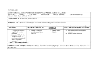 Este plano de aula apresenta quatro aulas de matemática para a 1a série do ensino médio. A primeira aula trata de relações binárias, a segunda de gráficos do produto cartesiano, a terceira de exercícios e introdução à função, e a quarta de exercícios de revisão. Cada aula tem objetivos gerais e específicos, conteúdos, recursos didáticos e métodos de desenvolvimento e avaliação.