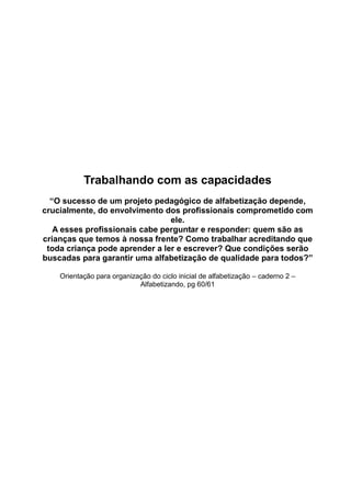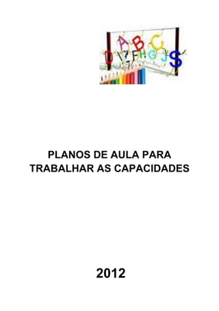 O documento apresenta um plano de aulas para trabalhar as capacidades relacionadas à alfabetização. Ele está dividido em cinco eixos principais: compreensão e valorização da cultura escrita, apropriação do sistema de escrita, leitura, produção escrita e desenvolvimento da oralidade. Cada eixo contém diversas capacidades a serem desenvolvidas, com atividades e estratégias sugeridas para cada nível de alfabetização, desde o pré-silábico até o alfabético. Na segunda parte, são apresentados dez text