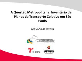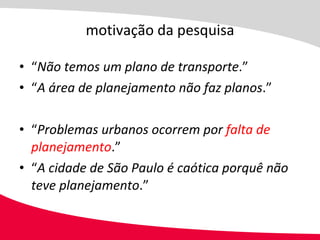 O documento discute planos de transporte coletivo em São Paulo entre 1926 e 2010. Apresenta uma lista com mais de 20 planos, desde o Plano da Light em 1926 até o Plano de Corredores Metropolitanos em 2010. O objetivo é analisar os antecedentes históricos e as razões para a não aplicação dos planos, focando nos aspectos setoriais do transporte metropolitano.