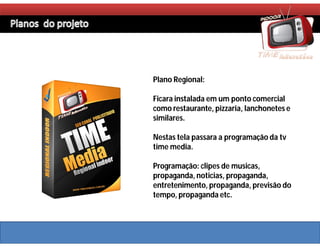 O documento descreve três planos de programação para telas em locais comerciais. O Plano Regional transmitiria programação da TV Time Media em restaurantes e lanchonetes. O Plano Corporativo transmitiria programação interna do cliente em bancos e hotéis. O Plano Lotérica transmitiria programação do cliente e de fora sobre jogos e loteria em casas lotéricas.