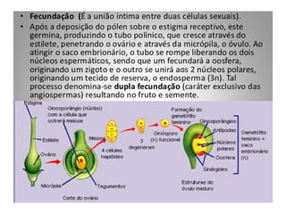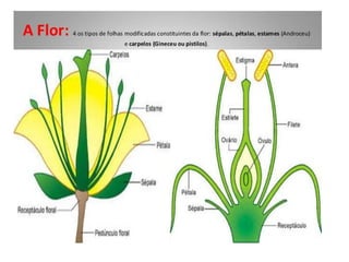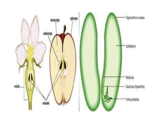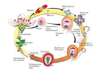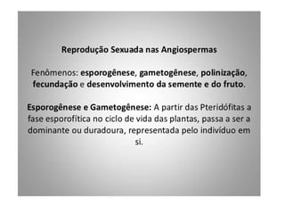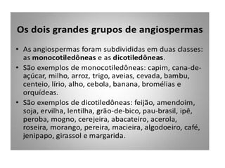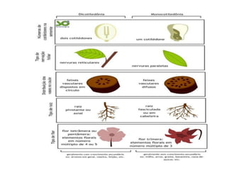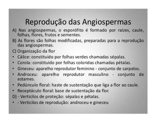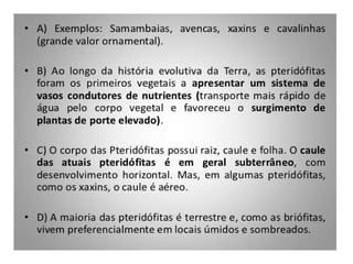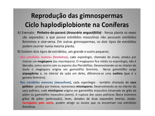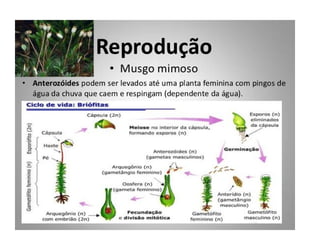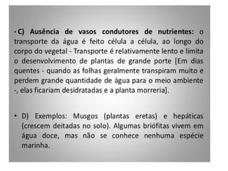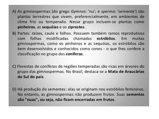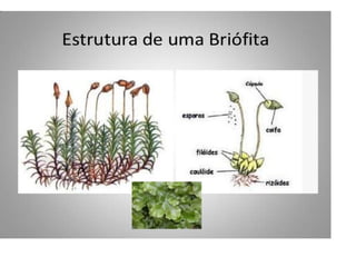 O documento descreve as principais características das briófitas, pteridófitas e gimnospermas. As briófitas e pteridófitas são plantas sem flores que se reproduzem por esporos. As gimnospermas possuem sementes nuas e estróbilos masculinos e femininos, mas não frutos. Exemplos incluem coníferas como pinheiros e abetos.