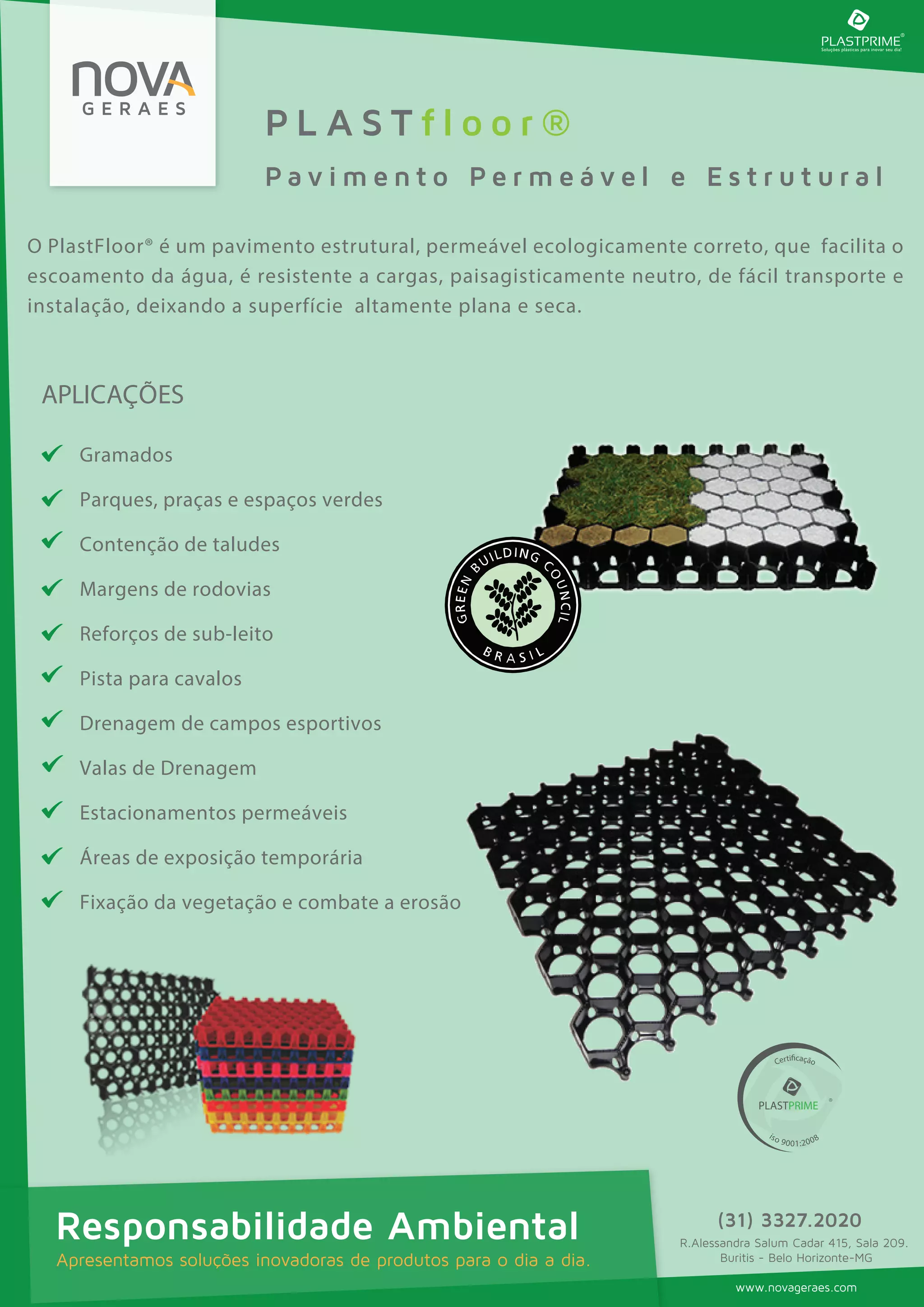 O PlastFloor® é um pavimento permeável e estrutural feito de plástico que facilita o escoamento da água, é resistente a cargas e de fácil instalação. Ele pode ser usado em gramados, parques, estacionamentos permeáveis e outras aplicações para drenagem e fixação da vegetação. A empresa Novagear oferece esse produto ecologicamente correto com o objetivo de apresentar soluções ambientais para o dia a dia.