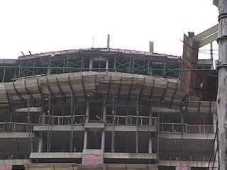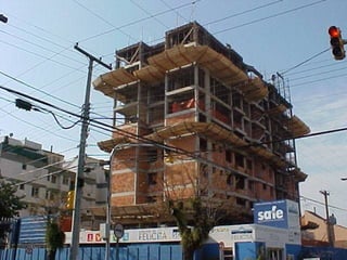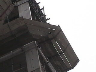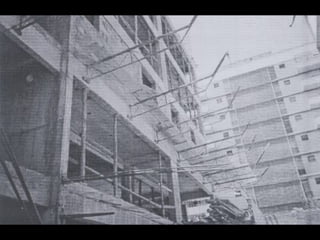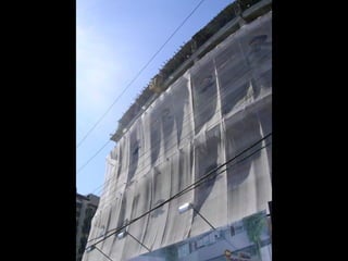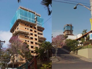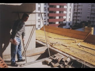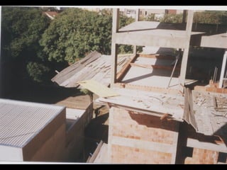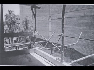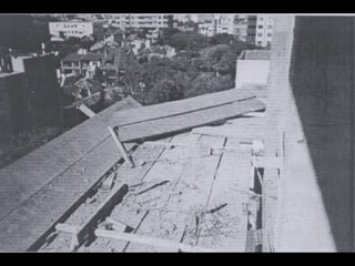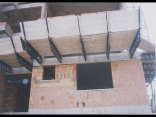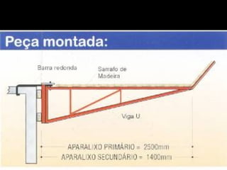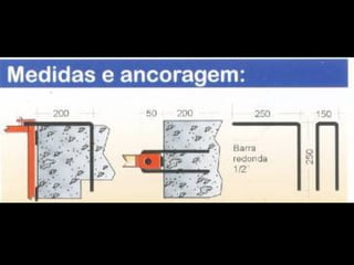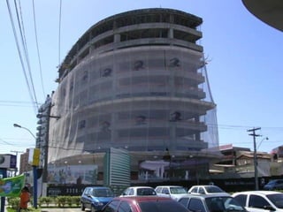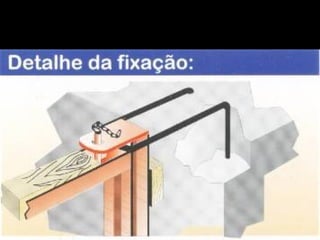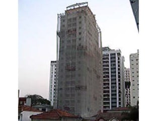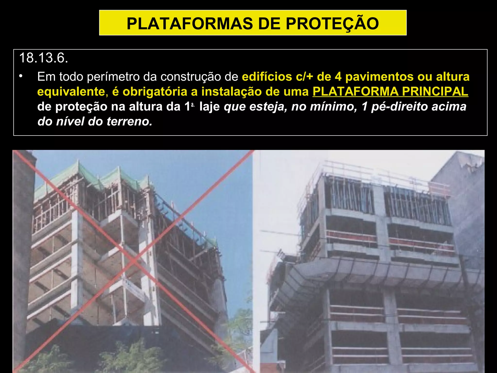 O documento descreve os requisitos para instalação de plataformas de proteção em obras de construção civil. Deve-se instalar uma plataforma principal acima do primeiro pavimento e plataformas secundárias a cada três lajes acima da principal. Detalha materiais permitidos, dimensões mínimas e procedimentos de montagem e desmontagem.
