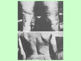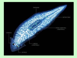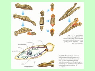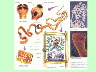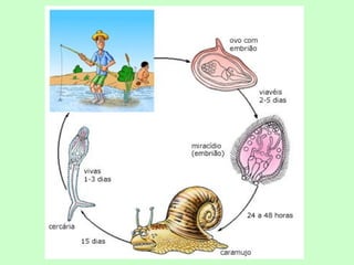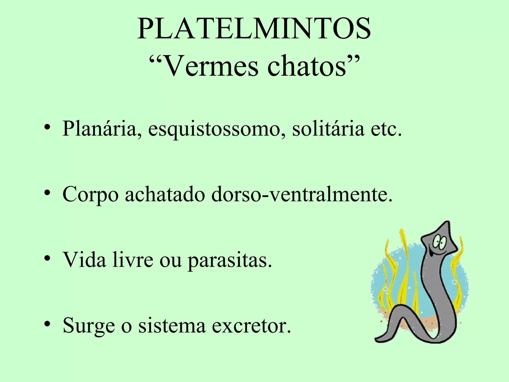 O documento descreve características gerais dos platelmintos, incluindo corpo achatado, vida livre ou parasita, respiração cutânea e sistema digestivo incompleto. Também aborda esquistossomose, teníase e cisticercose, parasitoses causadas por trematódeos e cestódeos que afetam o homem.