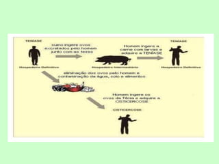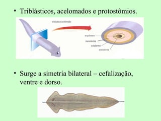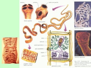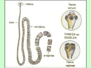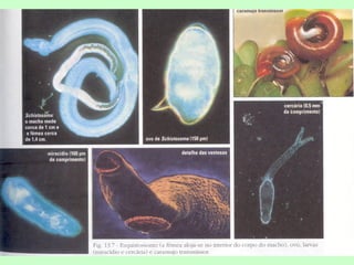 [1] Os platelmintos incluem vermes parasitas e de vida livre, com corpo achatado e sistemas excretor e nervoso primitivos; [2] Eles se classificam em Turbellaria, Trematoda e Cestoda, sendo os últimos dois grupos parasitas de animais e humanos; [3] A esquistossomose é causada pelo parasita Schistosoma mansoni e afeta fígado, baço e intestino.
