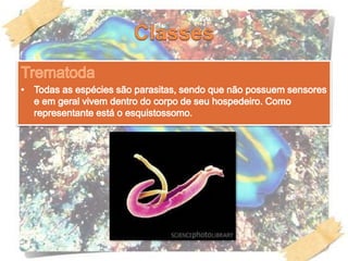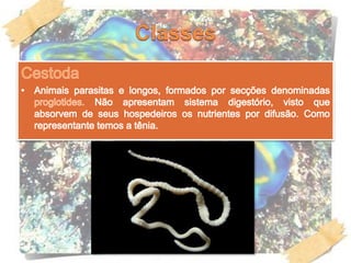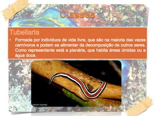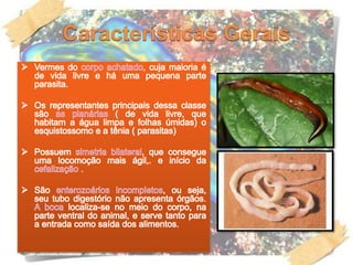 1) Os planárias possuem digestão externa e trocam gases através da pele. 2) Eles não têm sistema respiratório ou circulatório, e eliminam resíduos através da pele. 3) Os planárias têm dois gânglios nervosos na cabeça e sentidos primitivos de visão.