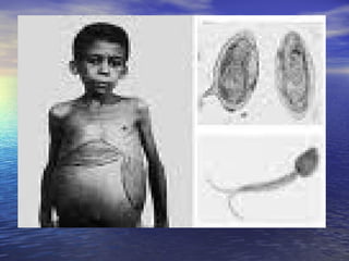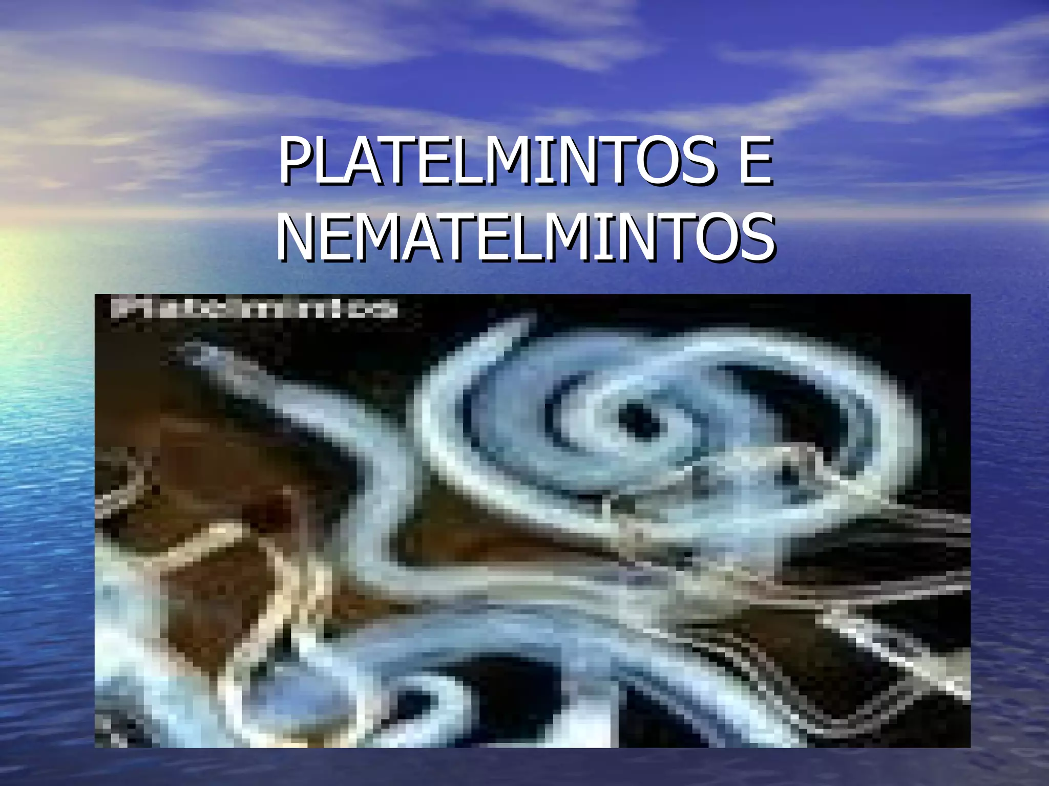 O documento descreve os principais grupos de platelmintos e nematelmintos. Platelmintos incluem planárias e tênias, enquanto nematelmintos incluem ancilostomos, piolhos e filárias. Muitos destes vermes podem causar doenças parasitárias como teníase, cisticercose e esquistossomose quando infectam seres humanos.