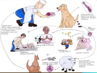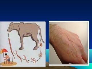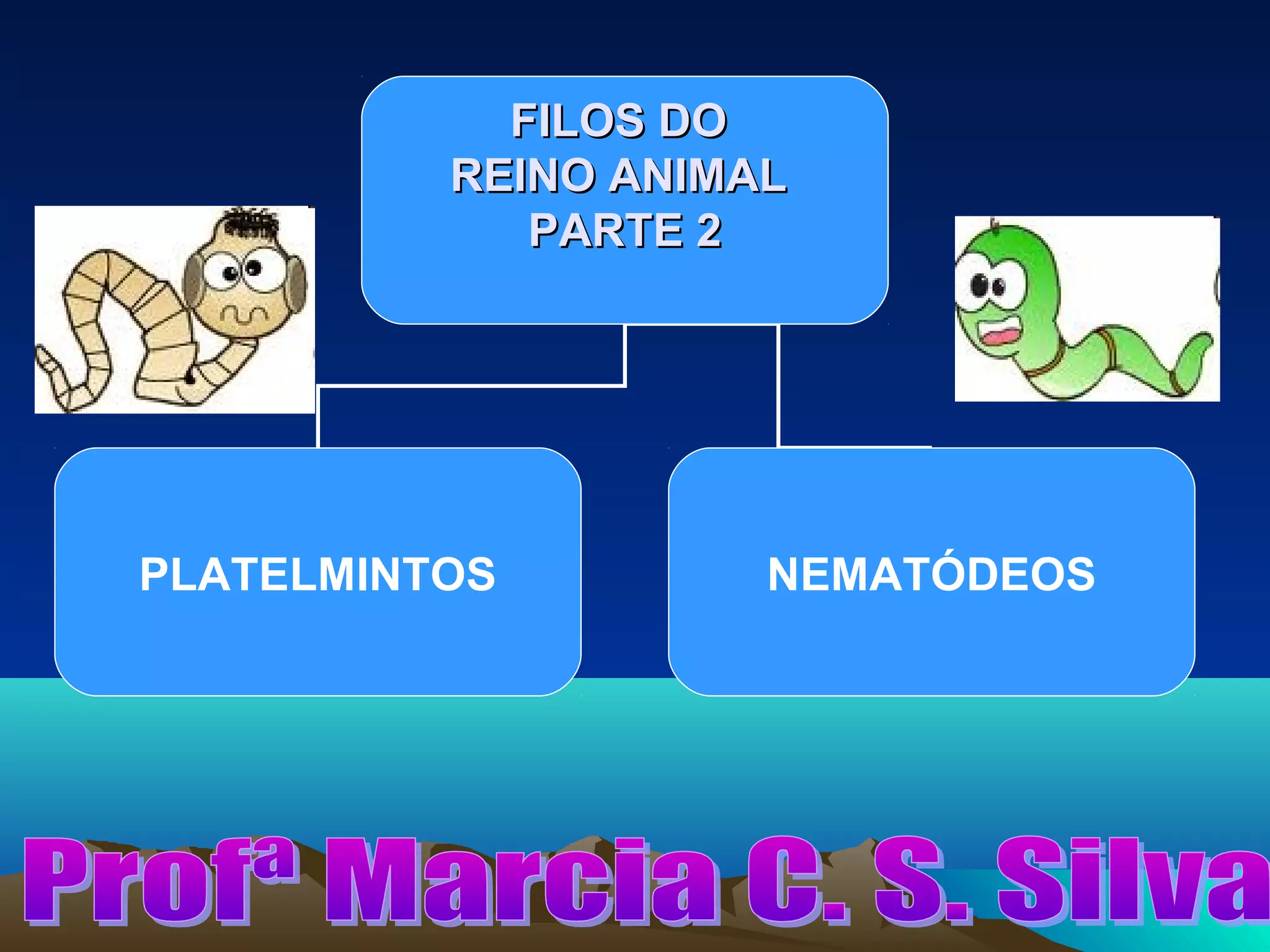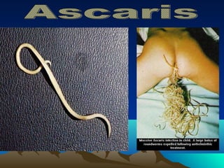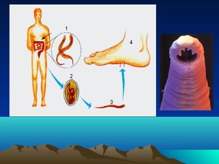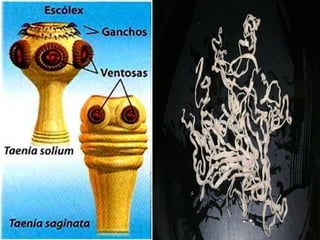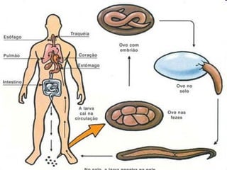 O documento descreve três classes de platelmintos: Turbelários, Trematódeos e Cestódeos. Os Turbelários incluem a planária e se reproduzem assexuadamente. Os Trematódeos incluem o Schistosoma mansoni, que causa esquistossomose e tem ciclo de vida complexo envolvendo humanos e caramujos. Os Cestódeos incluem tênias que parasitam o intestino humano. O documento também descreve Nematódeos, incluindo doenças como ascariíase,