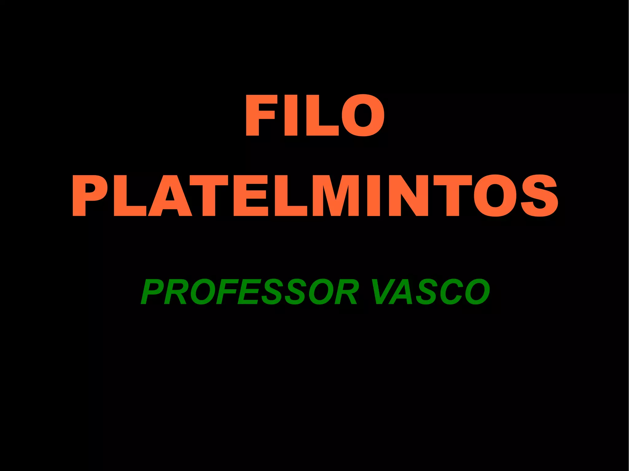 Este documento descreve as principais características dos platelmintos, incluindo que eles são animais achatados, sem órgãos circulatórios ou respiratórios, e divididos em três classes: Turbellaria, Trematoda e Cestoda. A classe Trematoda inclui o Schistosoma mansoni, que causa esquistossomose, enquanto a classe Cestoda inclui as tênias Taenia solium e Taenia saginata, que causam teníase quando os ovos são ingeridos por humanos.