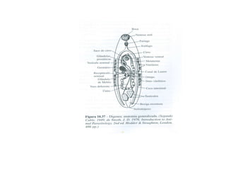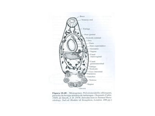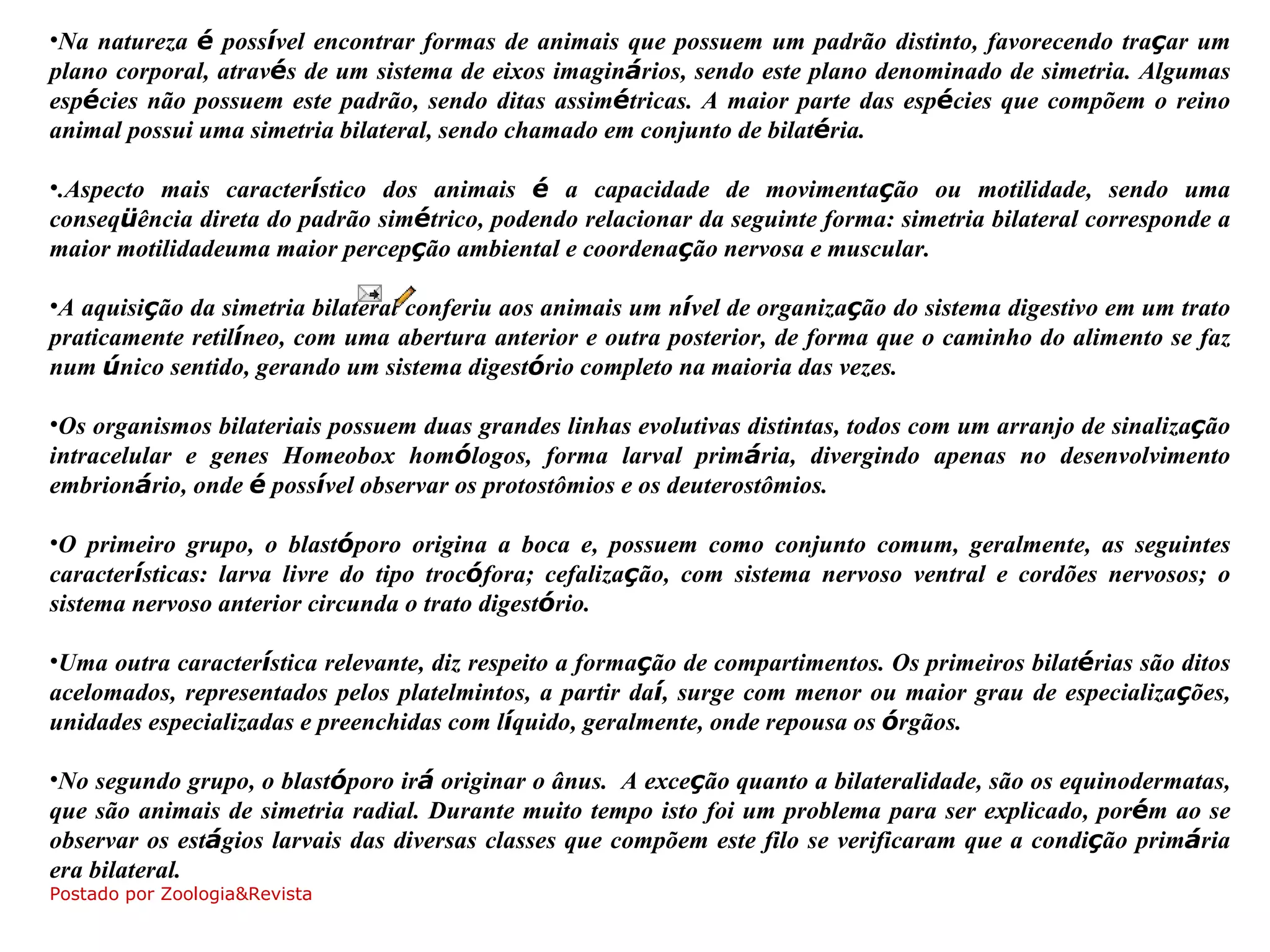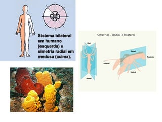 O documento discute a simetria e características evolutivas dos principais filos de animais bilateriais. A maioria dos animais possui simetria bilateral, conferindo maior motilidade e coordenação. Dois grandes grupos evoluíram de forma distinta: protostômios e deuterostômios. O filo Platelmintos é representado por vermes acelomados e parasitas como tênias.