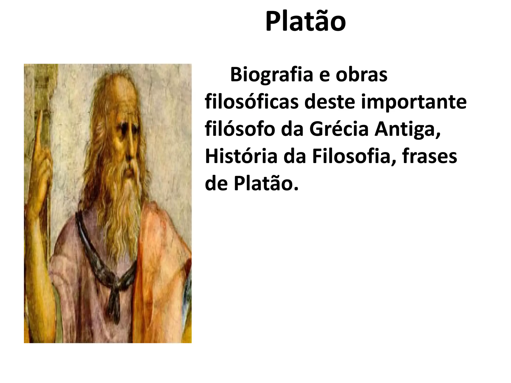 Platão foi um importante filósofo grego que viveu entre 427-347 aC. Ele fundou a Academia em Atenas para desenvolver as ideias de seu mestre Sócrates. Platão acreditava que o mundo sensível é imperfeito e que existe um mundo ideal das formas eternas e perfeitas. Suas obras mais influentes incluem A República, que discute a justiça, e O Banquete, que trata do amor.
