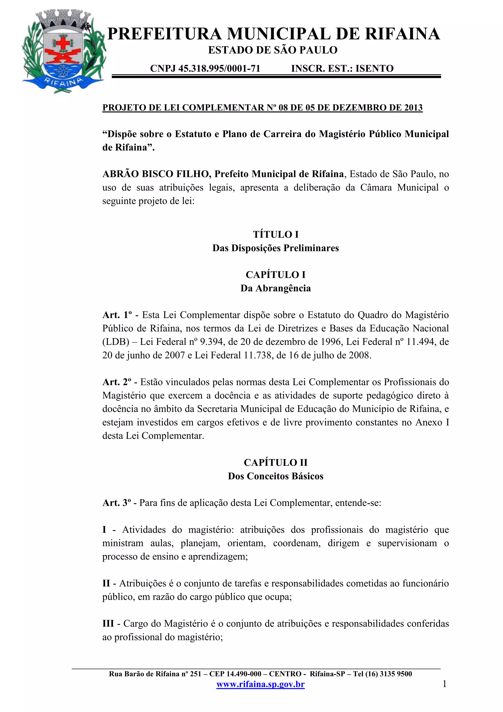 O projeto de lei complementar no 08 de 05 de dezembro de 2013 institui o estatuto e plano de carreira do magistério público municipal de Rifaina, São Paulo, regulando os cargos, atribuições, provimento e formas de ingresso no quadro do magistério. Os profissionais do magistério relacionados por esta lei abrangem docentes e suporte pedagógico, com definições claras de categorias, requisitos de provimento e critérios de avaliação de desempenho. A lei também estabelece diretrizes para a realização de concursos públicos e condições para a posse e estabilidade dos servidores.