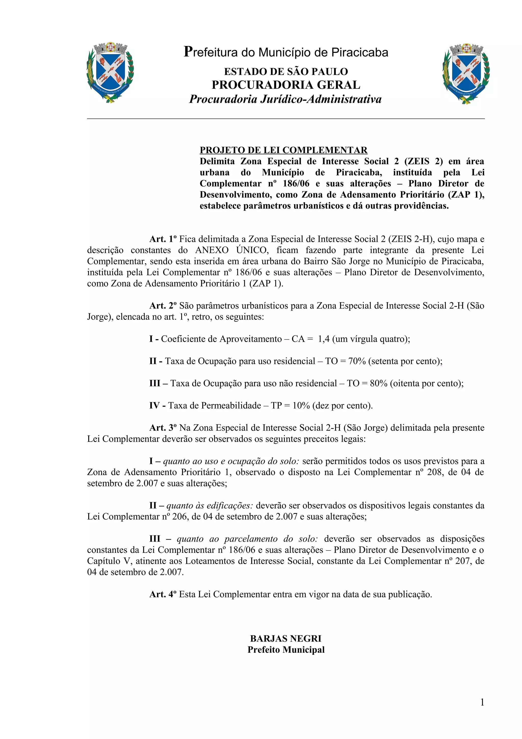 Este documento propõe uma lei complementar para delimitar uma Zona Especial de Interesse Social 2 (ZEIS 2-H) em área urbana do município de Piracicaba, definindo seus parâmetros urbanísticos. A ZEIS 2-H será inserida no Bairro São Jorge como Zona de Adensamento Prioritário 1 e permitirá a implantação de empreendimentos habitacionais de interesse social.