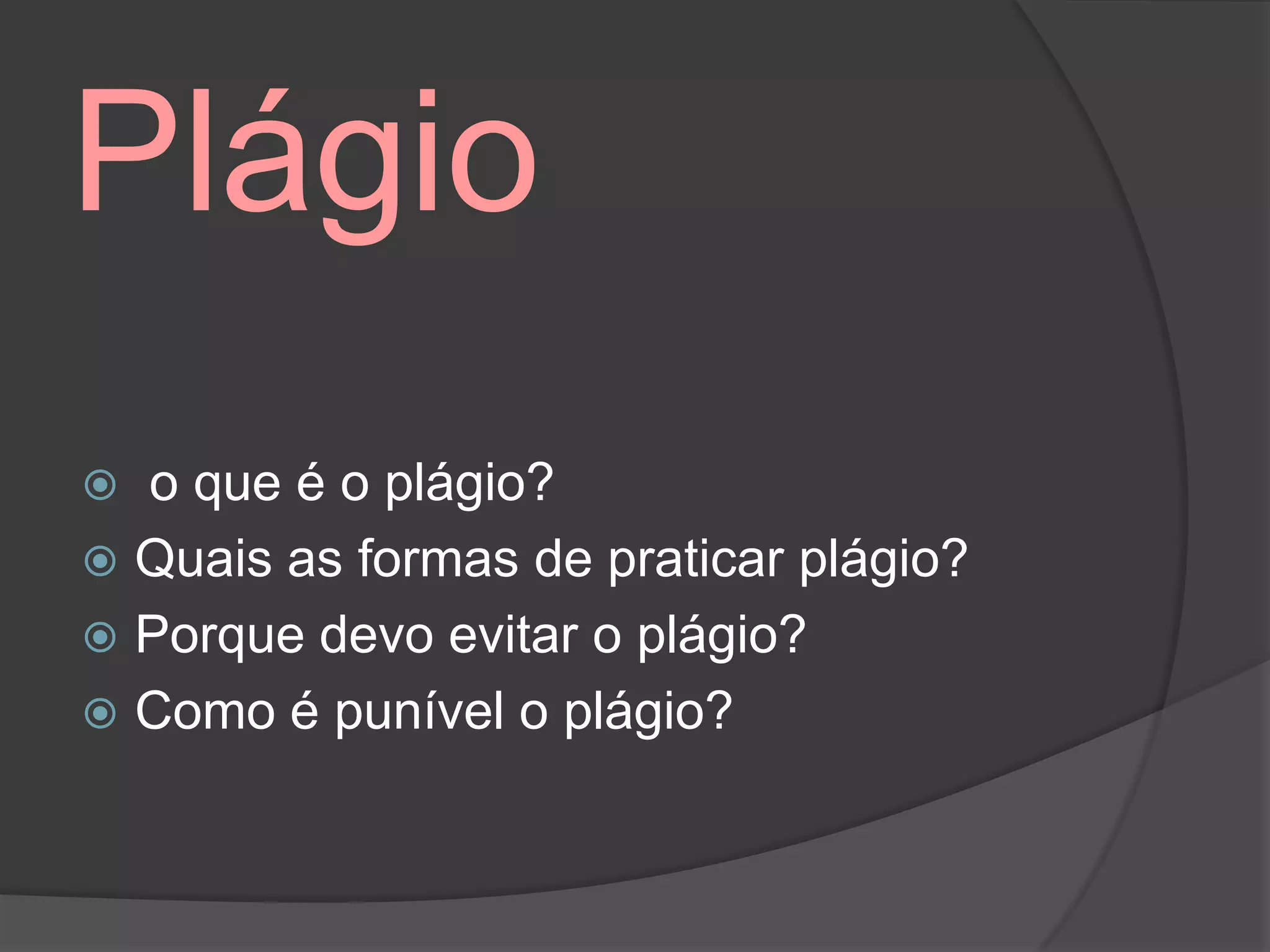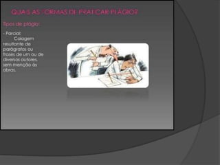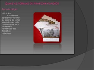 O documento discute o que é plágio, as formas de cometê-lo e por que deve ser evitado. O plágio é definido como apresentar o trabalho de outra pessoa como seu, sem dar os devidos créditos, e pode ser punido como crime.