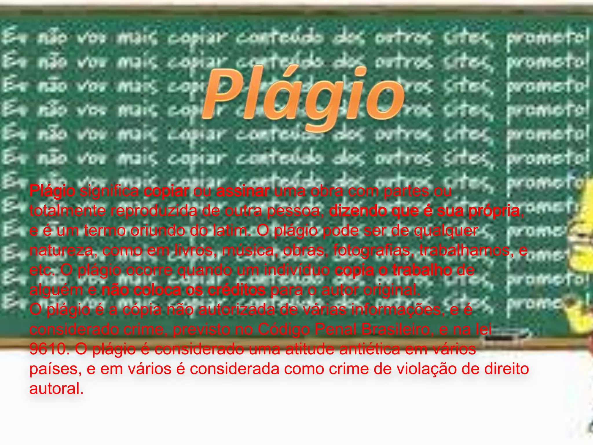 O documento discute o que é plágio, seus tipos e consequências. O plágio é definido como copiar ou reproduzir parte ou todo o trabalho de outra pessoa e apresentá-lo como seu, sem dar os devidos créditos ao autor original. Pode ocorrer em diversos tipos de obras e é considerado crime no Brasil.