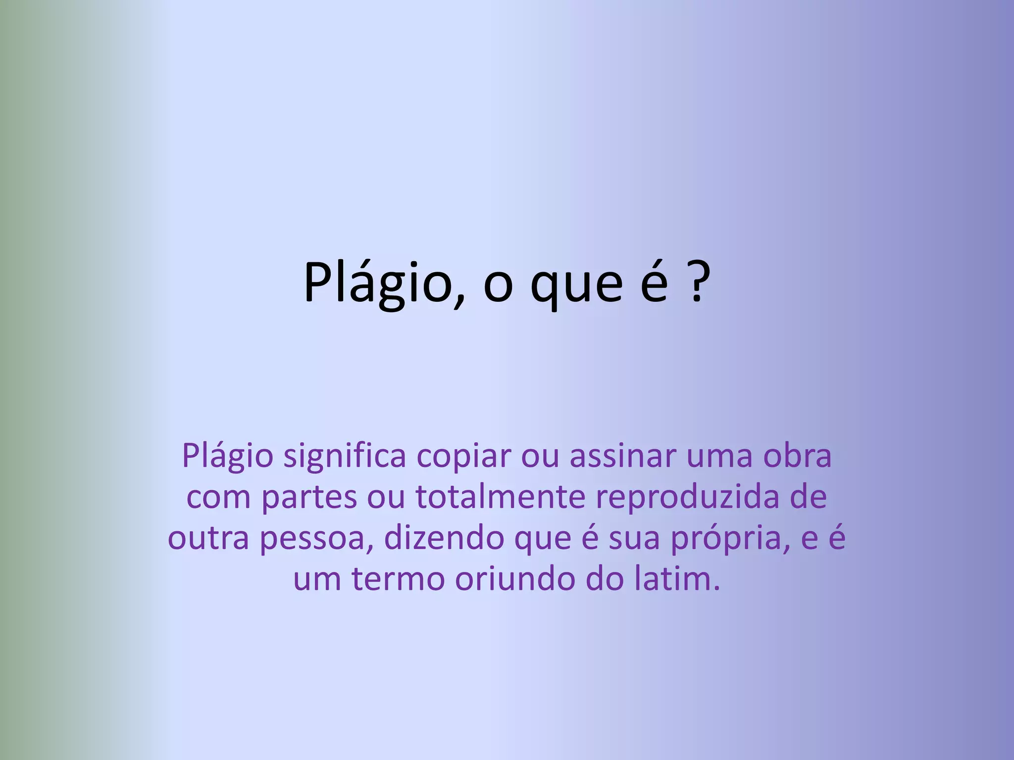 Plágio significa copiar total ou parcialmente o trabalho de outra pessoa e afirmar que é seu próprio. Blogs são sites atualizados frequentemente por um blogueiro e focados em um tópico. Eles surgiram em 1997 e se popularizaram em 1999 como diários virtuais ou para discutir assuntos variados.