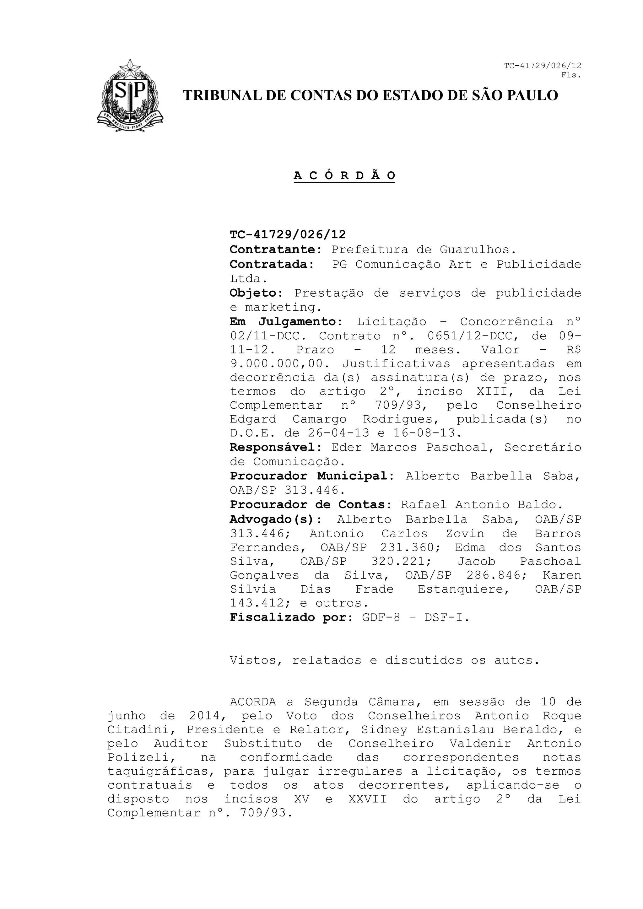 O Tribunal de Contas do Estado de São Paulo julgou irregulares a licitação, os termos contratuais e todos os atos decorrentes de um contrato entre a Prefeitura de Guarulhos e a empresa PG Comunicação Art e Publicidade Ltda. no valor de R$ 9.000.000,00 para prestação de serviços de publicidade e marketing.