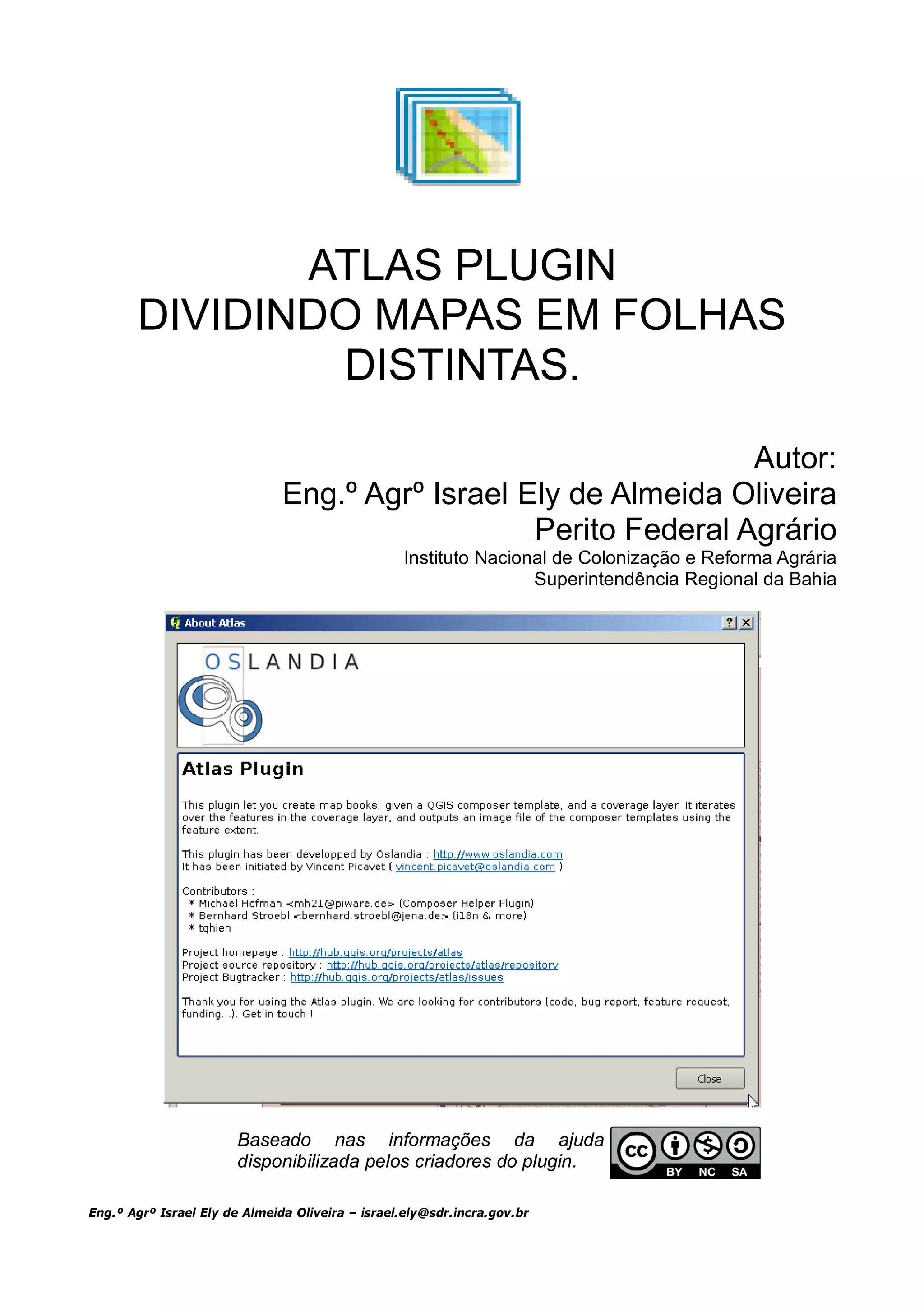 O documento descreve o plugin Atlas no Quantum GIS, que permite dividir mapas em várias folhas de impressão de forma organizada. O autor explica como instalar e configurar o plugin, incluindo como calcular o número de folhas necessárias com base nas dimensões do mapa e da folha de impressão, e como criar uma camada para guiar a impressão dos recortes.