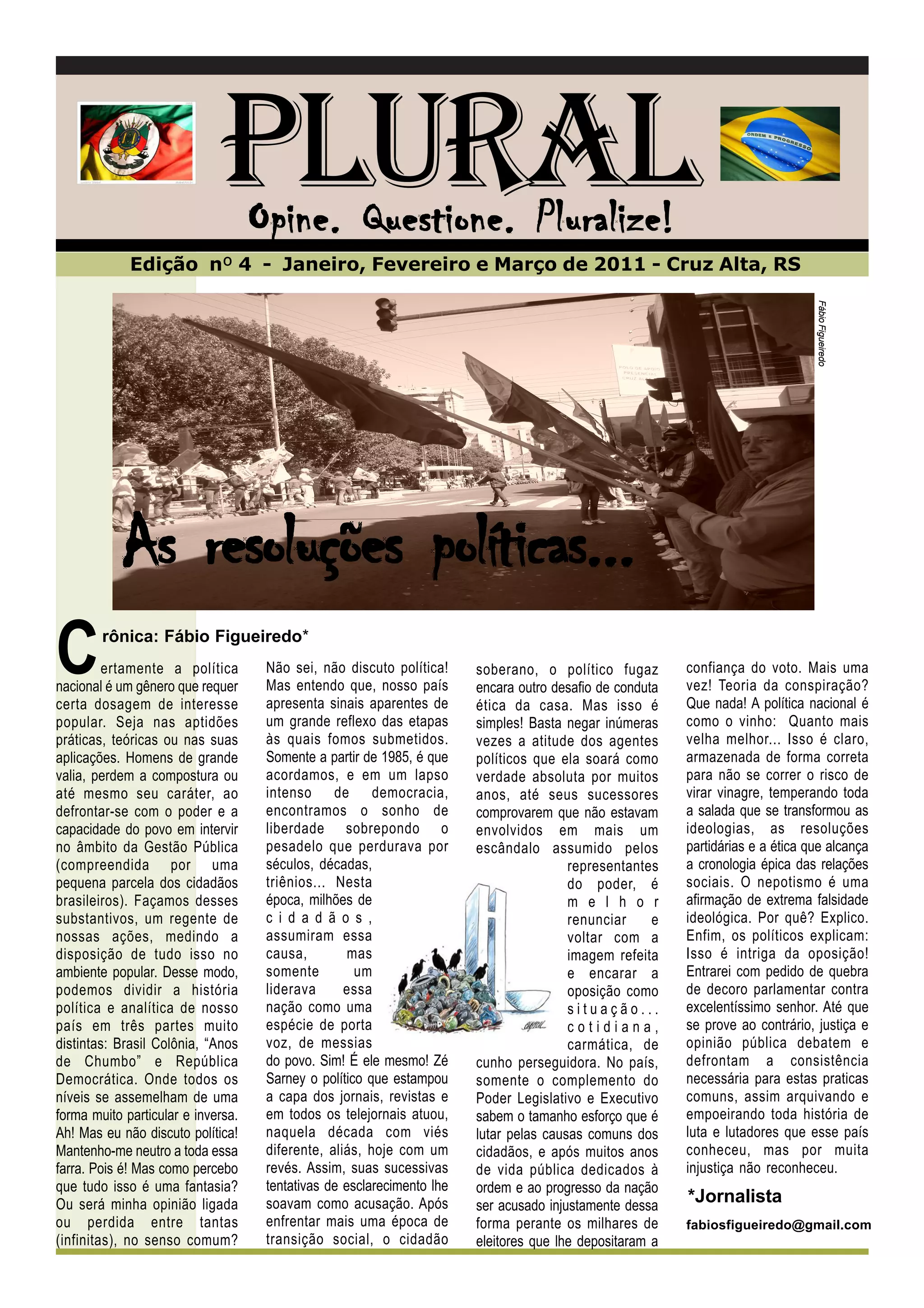 A edição 4 do jornal 'Plural' traz reflexões sobre a política nacional brasileira, abordando questões de ética, representatividade e participação cidadã. O texto destaca a relevância de se discutir temas políticos e sociais, além de criticar a falta de qualificação e representatividade nas ações do governo. Também é mencionada a importância da cultura e da arte, especialmente no contexto do rap, como formas de resistência e manifestação da identidade popular.