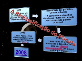 Este documento discute Plutão, o menor planeta anão no Sistema Solar. Aborda a origem do seu nome, sua localização distante do Sol, e suas características físicas e atmosféricas únicas, como seu pequeno tamanho e temperaturas extremamente baixas. Também explica a reclassificação de Plutão como um planeta anão em 2006 pela União Astronômica Internacional.