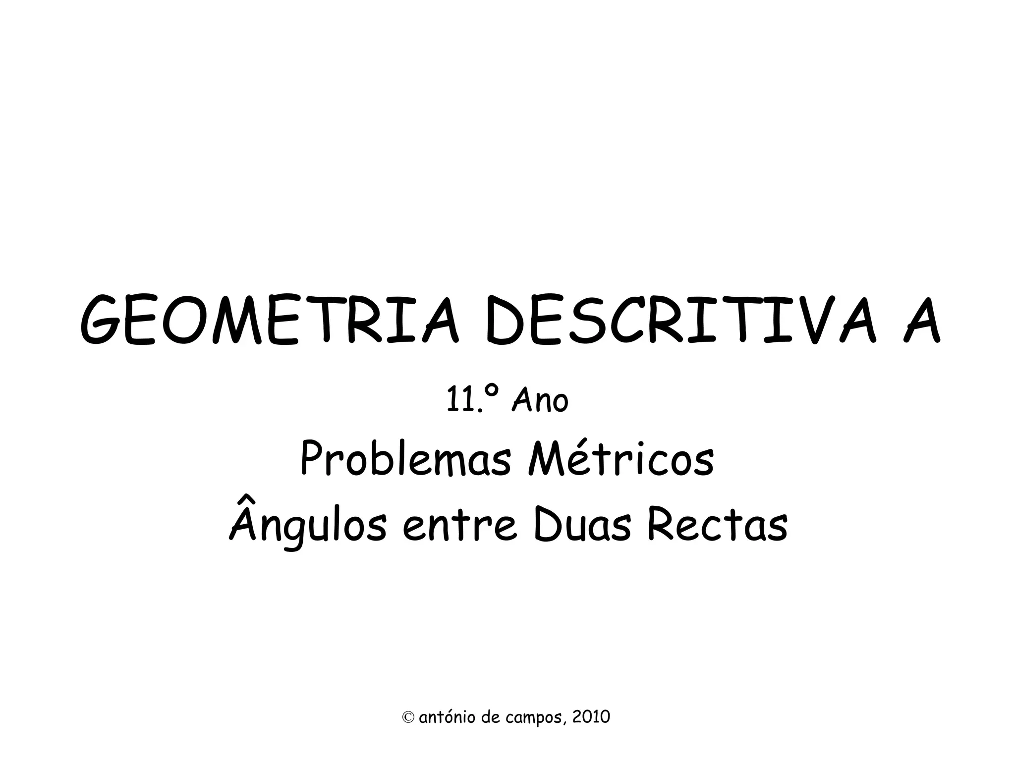 O documento discute vários tipos de ângulos entre duas retas em geometria descritiva. Explica como calcular a grandeza de ângulos entre retas paralelas, concorrentes, horizontais, frontais e oblíquas usando projeções auxiliares. Fornece exemplos passo a passo de como determinar a grandeza de ângulos entre diferentes combinações de retas.