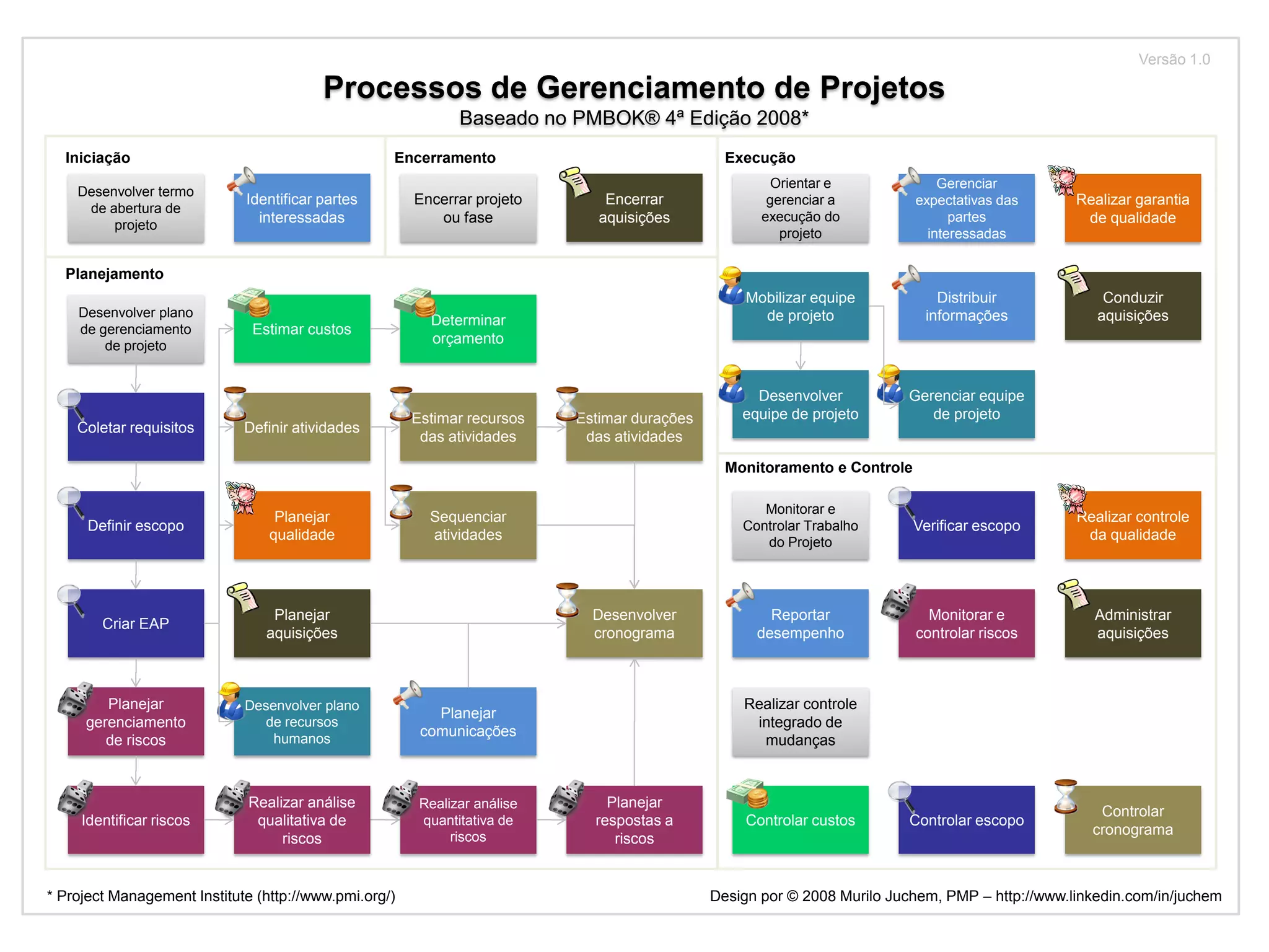 O documento apresenta os processos de gerenciamento de projetos de acordo com o Guia PMBOK. Ele descreve os processos agrupados nas fases de Iniciação, Planejamento, Execução, Monitoramento e Controle e Encerramento, incluindo atividades como desenvolver o escopo, cronograma, orçamento, plano de gerenciamento de riscos e equipe, além de monitorar o trabalho, riscos e mudanças.