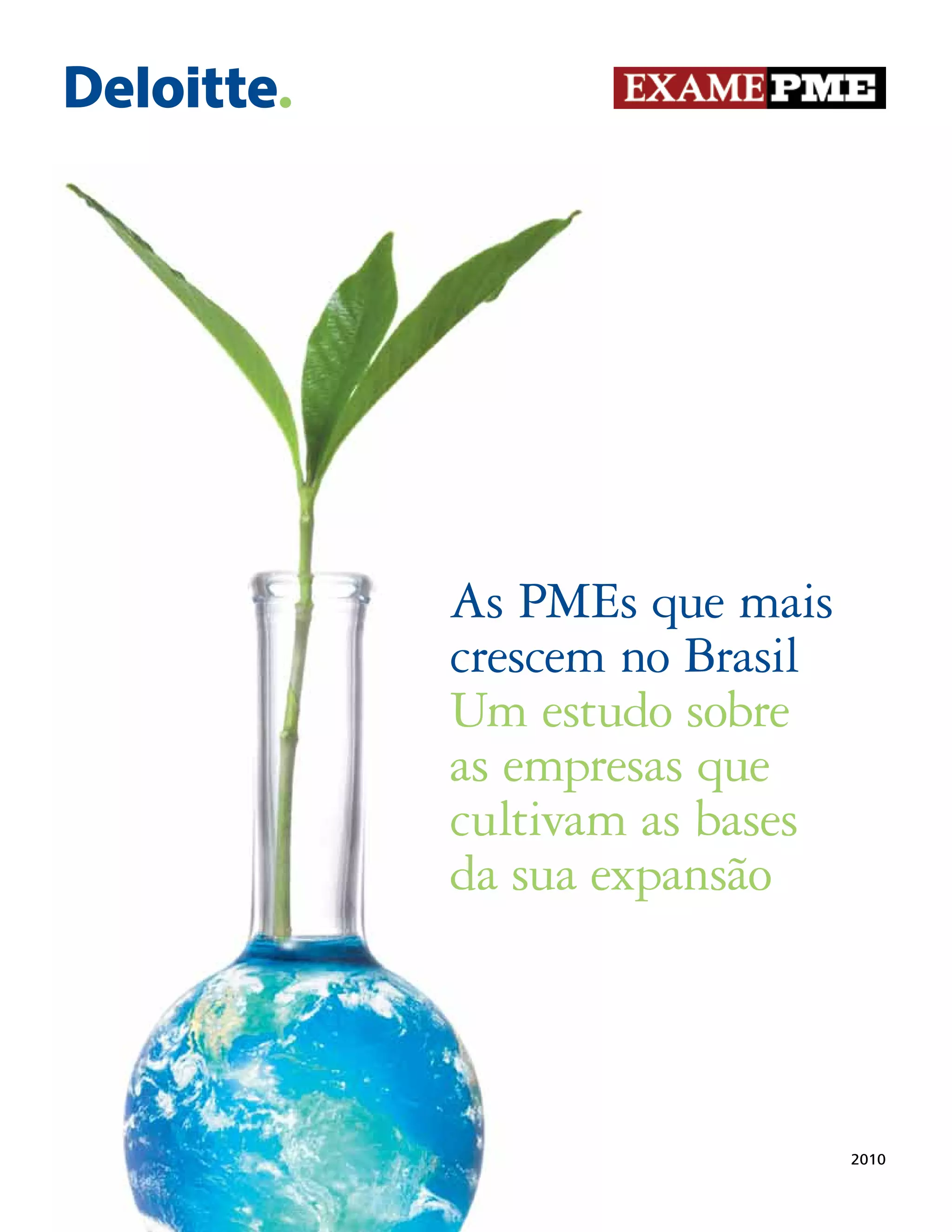 Este documento resume um estudo sobre as pequenas e médias empresas (PMEs) que mais cresceram no Brasil entre 2007-2010. A pesquisa analisou 330 PMEs com receita entre R$5-200 milhões que cresceram significativamente nesse período. O estudo mostra que essas empresas se prepararam bem para aproveitar as novas oportunidades do cenário econômico brasileiro, diversificando clientes e parcerias, reduzindo custos e expandindo operações no Brasil e exterior.
