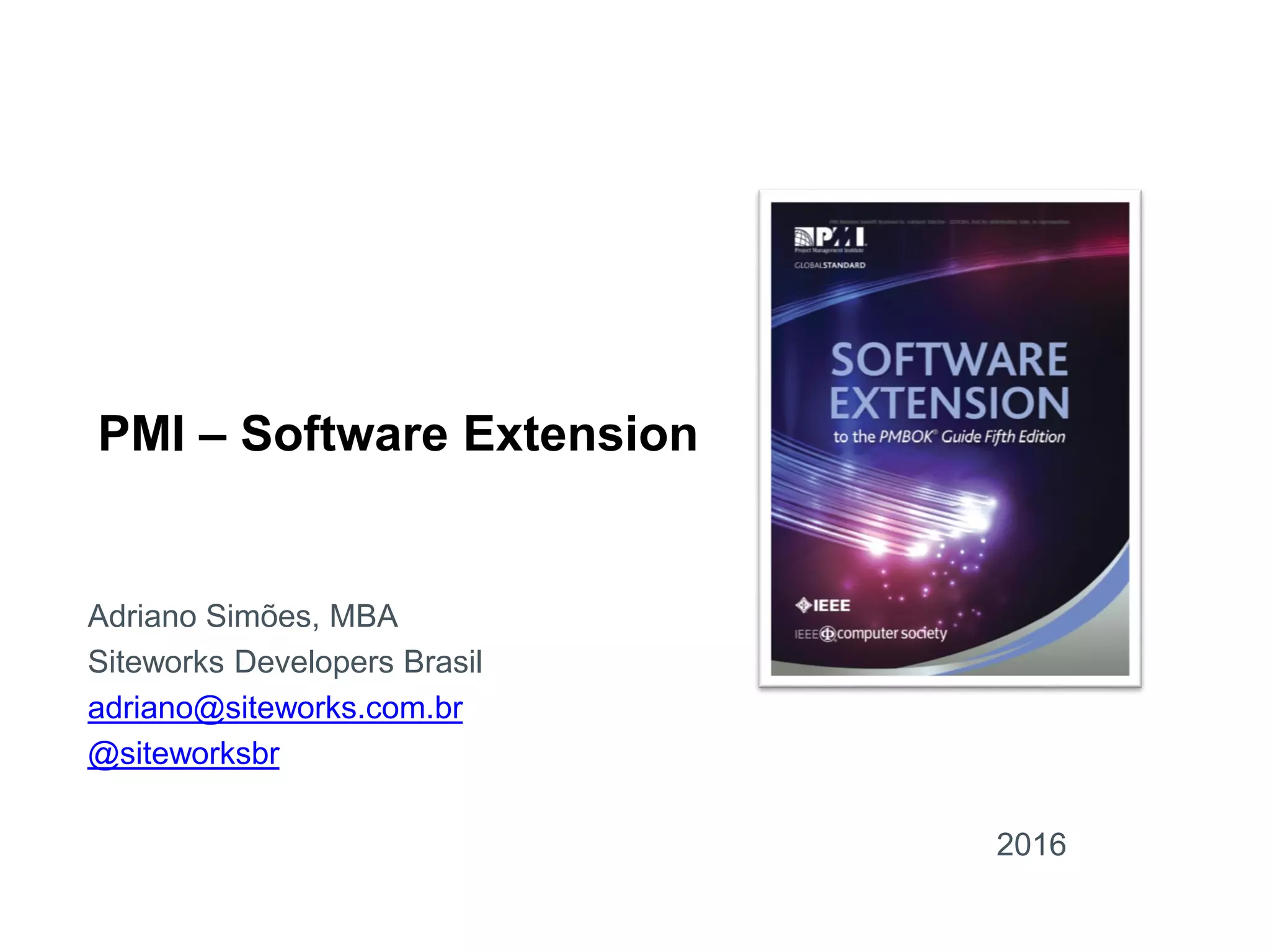 O documento discute a realidade dos projetos de software e as extensões feitas pelo PMI ao Guia PMBOK® para melhor gerenciar projetos de software. As áreas de gerenciamento de tempo, custos e escopo receberam a maioria das adaptações devido aos frequentes problemas nessas áreas em projetos de software. A extensão propõe novas ferramentas e técnicas para melhor gerenciar cada uma das áreas de conhecimento em projetos de software.