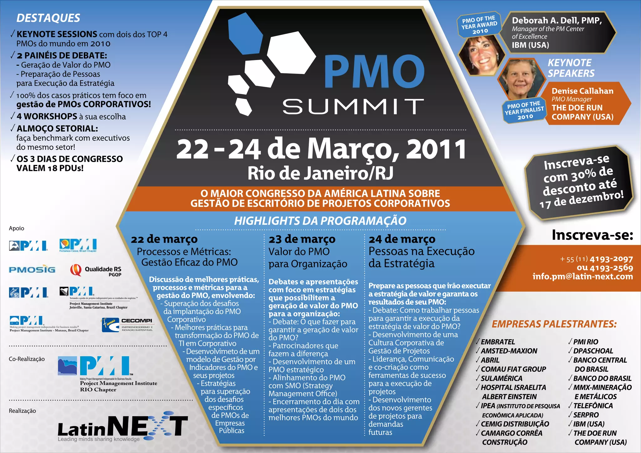 O primeiro dia do congresso abordará processos e métricas para a gestão eficaz de PMOs corporativos, com sessões sobre como supere os desafios da implantação de PMOs corporativos e as melhores práticas para transformar PMOs de TI em corporativos. Dois workshops simultâneos irão discutir esses temas, focando nos processos, perfis de profissionais e estratégias de comunicação de mudança necessárias.
