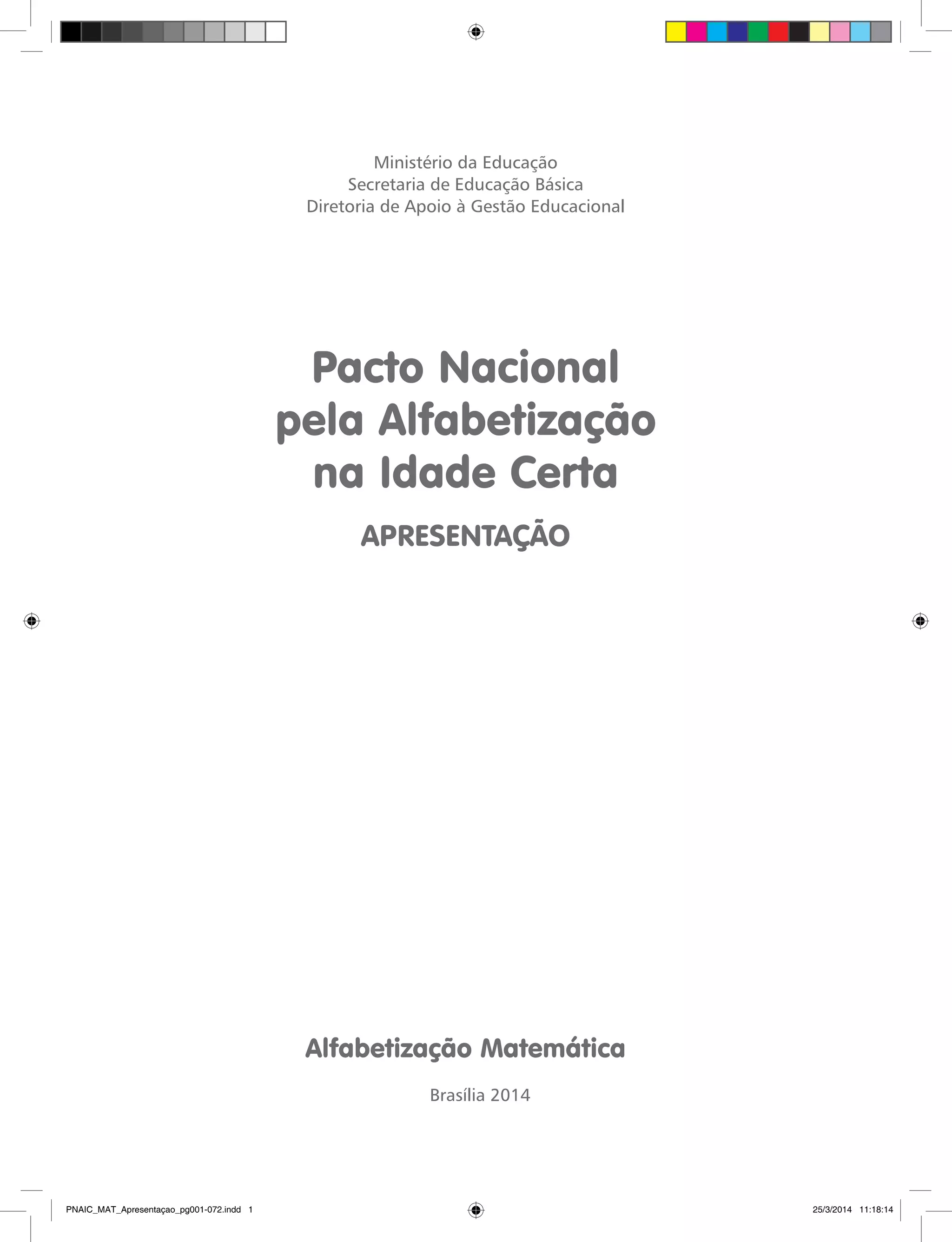 Este documento apresenta o material de formação para professores que ensinam Matemática no âmbito do Pacto Nacional pela Alfabetização na Idade Certa. O material destaca a importância da formação continuada dos professores alfabetizadores em todas as áreas, incluindo a Matemática, para que as crianças se tornem verdadeiramente alfabetizadas. O documento também discute os princípios da formação continuada orientada pelo Pacto e introduz os temas abordados nos cadernos, como a alfabetização matemática, os direitos de