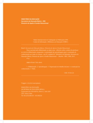 O documento discute a importância da progressão e continuidade das aprendizagens para garantir que todas as crianças construam conhecimento no ciclo de alfabetização. Apresenta a evolução histórica dos métodos de alfabetização e a proposta dos ciclos de alfabetização como forma de assegurar que os estudantes progridam em seus estudos de maneira inclusiva. Também reflete sobre os desafios das práticas pedagógicas no ciclo de alfabetização.