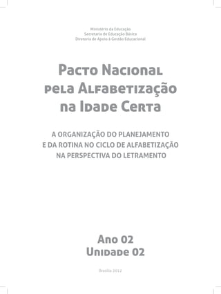 Este documento discute a organização do planejamento e das rotinas no ciclo de alfabetização na perspectiva do letramento. Aborda a importância do planejamento para o ensino dos componentes curriculares, em especial a Língua Portuguesa. Também apresenta objetivos e estratégias para o planejamento dos eixos da análise linguística, leitura, produção de textos orais e escritos.