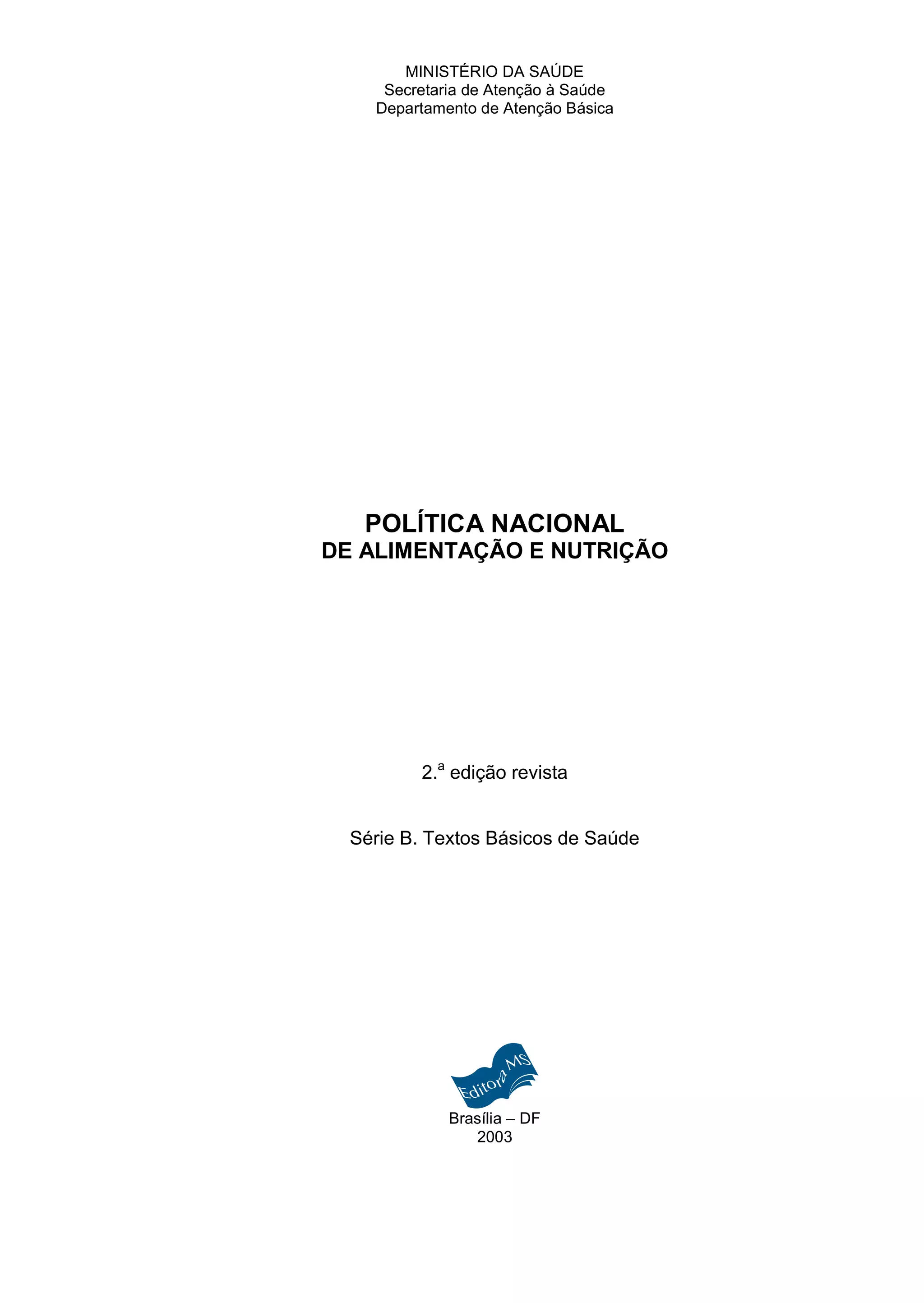 Este documento apresenta a Política Nacional de Alimentação e Nutrição do Ministério da Saúde do Brasil. A política estabelece sete diretrizes principais: 1) estímulo a ações intersetoriais para garantir o acesso universal aos alimentos; 2) garantia da segurança e qualidade dos alimentos; 3) monitoramento da situação alimentar e nutricional; 4) promoção de práticas alimentares e estilos de vida saudáveis; 5) prevenção e controle de distúrbios e doenças nutricionais; 6