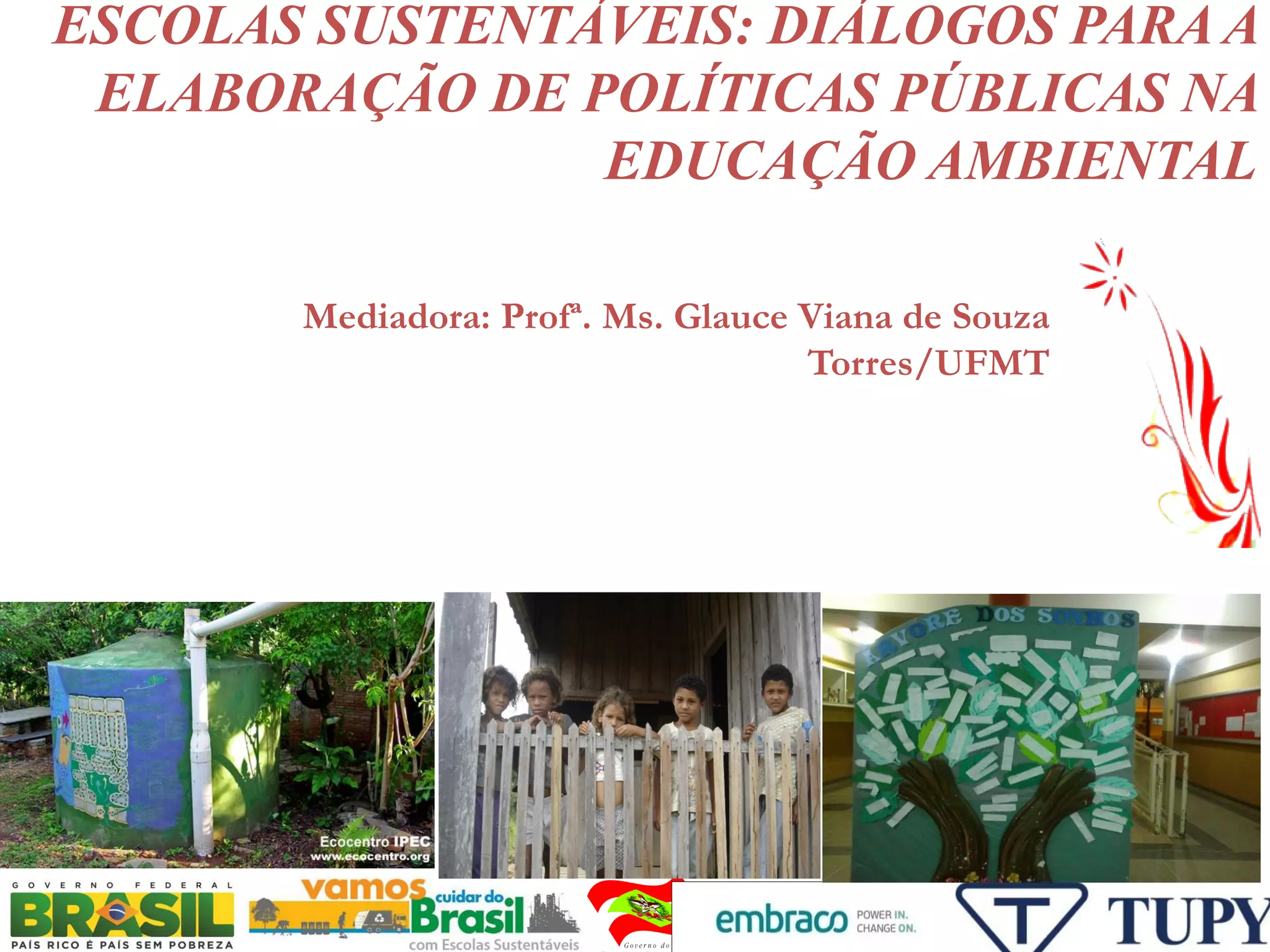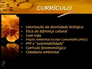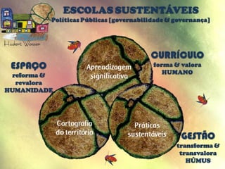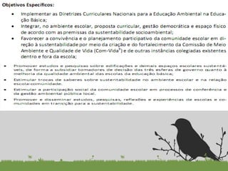 O documento discute a educação ambiental nas escolas e a elaboração de políticas públicas. Apresenta conceitos, princípios e diretrizes da educação ambiental referenciados pela legislação brasileira. Debate a importância da escola ser um espaço educador sustentável que integre conhecimentos ambientais no currículo e na gestão da escola.