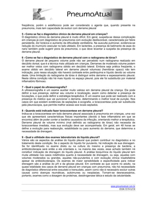 O documento discute pneumonia com derrame pleural na infância. Ele descreve que derrame pleural ocorre em cerca de 5-10% das pneumonias em crianças e geralmente não requer drenagem, apenas tratamento com antibióticos. O documento também fornece diretrizes sobre quando a drenagem ou outros procedimentos como toracocentese ou pleuroscopia podem ser necessários com base nos achados clínicos e de exames.