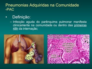 1) O documento discute pneumonias adquiridas na comunidade, incluindo definição, incidência, agentes etiológicos, quadro clínico e exames complementares.