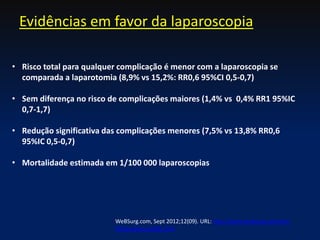 Este documento discute métodos para criação de um pneumoperitônio durante cirurgia laparoscópica. Ele descreve as técnicas de Agulha de Veress, Hasson e entrada direta de trocarte, e discute evidências de que a laparoscopia apresenta menos riscos do que a laparotomia. O documento também aborda possíveis complicações vasculares, viscerais e de parede abdominal durante o acesso inicial, concluindo que a experiência do cirurgião é essencial para escolher a técnica mais segura.