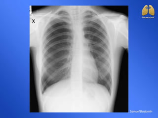O documento descreve o pneumotórax, definindo-o como o acúmulo de ar na cavidade pleural e classificando-o em fechado, aberto e hipertensivo. Também aborda a etiologia, diagnóstico e tratamento, incluindo observação, punção aspirativa ou drenagem pleural dependendo do tamanho e tipo de pneumotórax. O tratamento do pneumotórax espontâneo primário é discutido em detalhes.