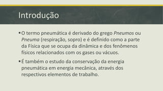 O documento discute os conceitos básicos da pneumática, incluindo propriedades do ar comprimido, instalações de produção de ar comprimido, compressores, válvulas de controle e atuadores pneumáticos.