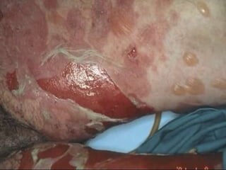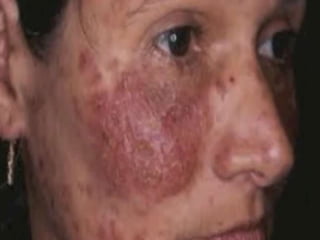 O documento descreve uma doença autoimune que afeta a pele e as mucosas, causando a dissolução das pontes entre as células da derme, resultando em bolhas e úlceras dolorosas e sanguinolentas na boca. O diagnóstico é baseado em características clínicas, histopatológicas e imunológicas, e o tratamento envolve altas doses de corticoesteroides.